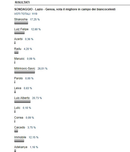 Il vostro migliore in campo è Milinkovic che si è aggiudicato il 26.81% dei voti. Al secondo posto c'è Luis Alberto col 20.73%, seguito da Strakosha (17,25%). I due fari del centrocampo e il portiere biancoceleste hanno permesso di battere il Genoa con un risultato rotondo e mai in discussione.
