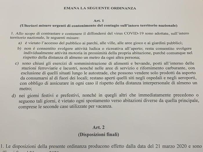 Il Ministero della Salute ha emesso una nuova ordinanza per cercare di contenere il contagio da coronavirus. Il nuovo testo ha "vietato l'accesso a parchi, ville, aree gioco e giardini pubblici". Per quanto riguarda lo sport "resta consentito svolgere individualmente attività motoria nei pressi della propria abitazione, purché nel rispetto della distanza di almeno un metro da ogni altra persona". Nei giorni festivi e prefestivi è vietato ogni spostamento verso abitazioni diverse da quella principale. Vengono chiusi gli esercizi di somministrazione di alimenti e bevande nelle stazioni ferroviarie e lacustri e nelle aree di servizio, ad eccezione di quelli presenti sulle autostrade, che possono vendere solo prodotti da asporto da consumare fuori dai locali. Rimangono aperti invece quelli negli ospedali e aeroporti, con l'obbligo di far rispettare la distanza di sicurezza di almeno un metro. Queste nuove misure, che si sommano alle esistenti, sono valide dal 21 marzo al 25 marzo, quando scade il dpcm che aveva imposto la stretta a tutti gli spostamenti e la chiusura di bar e negozi.