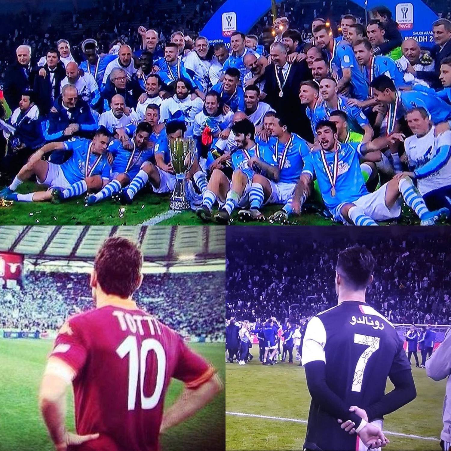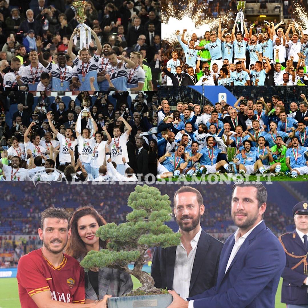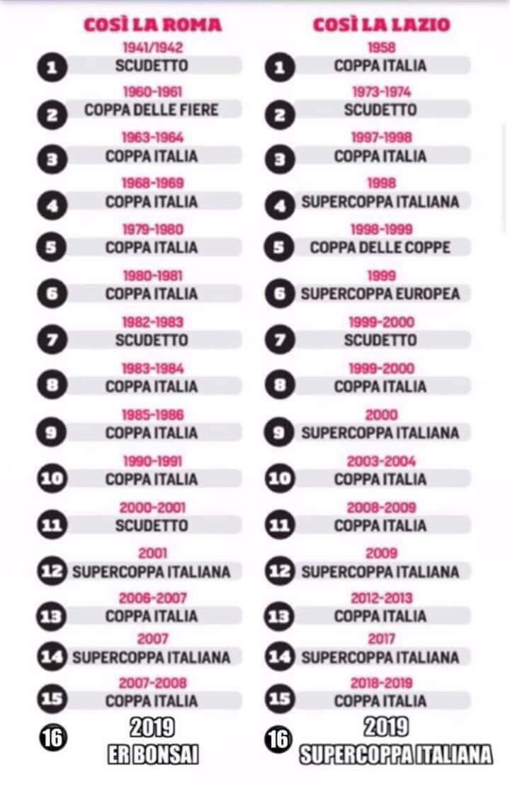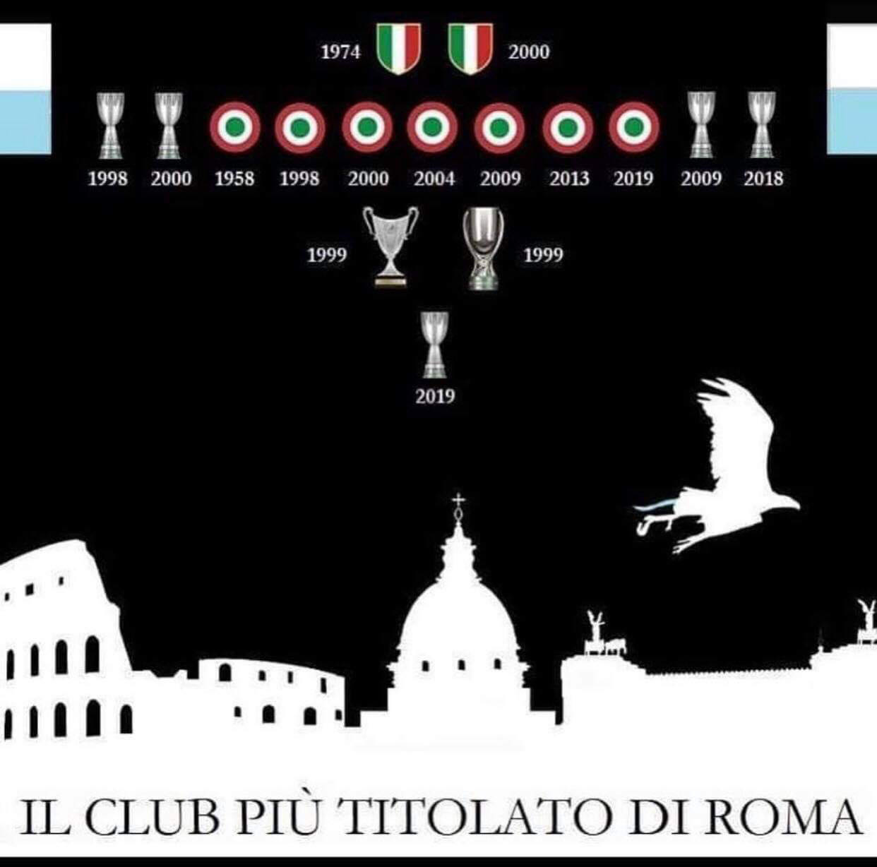 Come è giusto che sia, dopo la vittoria di un trofeo è lecito festeggiare a dismisura. La Lazio può farlo, può ammirare e scuotere al cielo la sua Supercoppa italiana. E, sempre come giusto che sia, è doveroso che lo sfottò abbia inizio. Sui social i tifosi biancocelesti si sono scatenati, tra un grido di gioia e l'altro hanno pensato di creare qualche collage significativo. Ce ne sono diversi, per tutti i gusti. Vittima preferita? Ovviamente la Roma. Dall'altra parte del Tevere, l'aria di trofeo non si respira ormai da un po'. Ed ecco che viene stilata la lista delle coppe alzate dai due club: nel 2019, un bel bonsai per la Roma tenta di pareggiare i conti con la fresca Supercoppa italiana biancoceleste. C'è chi ricorda la postura di Totti, quel famoso 26 maggio, intento a guardare la Lazio festeggiare la vittoria in Coppa Italia. La stessa, guarda caso, che ha assunto ieri Cristiano Ronaldo nel netto 3 a 1 per i biancocelesti. E poi la foto dei festeggiamenti di Immobile e compagni, posizionati sul prato verde con la Supercoppa italiana in bella vista, viene leggermente modificata: tra le maglie biancocelesti sbucano i volti di Nainggolan, De Rossi e Totti. Non poteva mancare l'espressione basita della tifosa juventina, che rispetto alla partita dell'Olimpico viene vestita con i classici indumenti arabi. Come detto, ce ne è per tutti. Una cosa è sicura: il club più titolato a Roma è la Lazio.