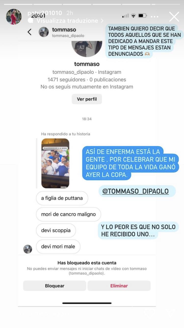 Il limite è stato ormai superato, Patricia, moglie di Luis Alberto si è inorridita dagli ultimi messaggi deplorevoli, se così si possono definire, ricevuti dai tifosi della Roma. Ieri sera la squadra di Mourinho ha perso in finale di Europa League contro il Siviglia, squadra in cui il Mago ha anche giocato e di cui Patricia ne è tifosa. Infatti, come abbiamo riportato, non appena la squadra biancorossa ha vinto ai calci di rigore, in casa Alberto è scoppiata la festa. Tra le celebrazioni social, anche quelle di sua moglie, sfociate nella pagina più brutta dello sport. Patricia è stata bersagliata a più riprese da minacce di morte e lo testimonia una sua storia su Instagram in cui segnala la vicenda con i suoi follower: "Ecco quanto è malata la gente, per aver festeggiato la mia squadra che tifo da una vita e ieri ha vinto la coppa. E la cosa peggiore - continua - è che non ne ho ricevuto solo uno. Voglio anche dire che tutti coloro che si sono dedicati a mandare questo tipo di messaggi, sono stati denunciati". Tra i più orridi: "Figlia di p*****a, mori de cancro maligno, devi morì male". Qui sotto la denuncia social di Patricia.