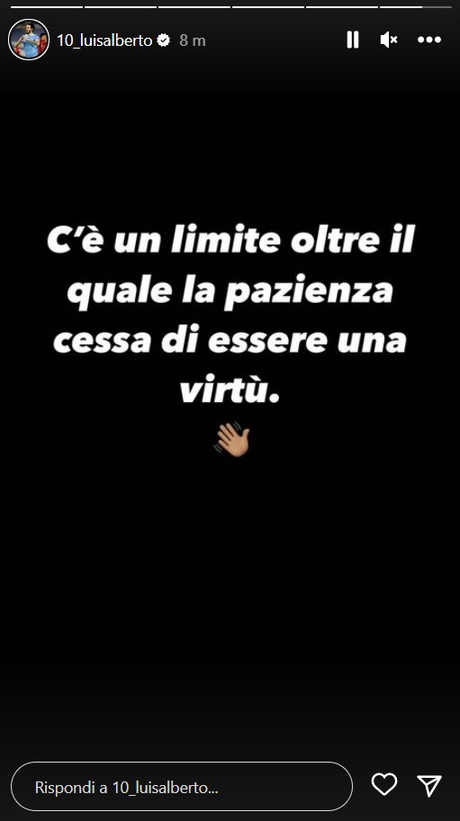 Nel giorno in cui la società annuncia il rinnovo di Pedro, Luis Alberto su Instagram spaventa l'ambiente. Il 'Mago', sul proprio profilo, ha pubblicato una storia a dir poco criptica in cui scrive: "C'è un limite oltre il quale la pazienza cessa di essere una virtù". L'emoticon della mano che saluta è la ciliegina su una torta amara da mandere giù per i tifosi della Lazio. Il centrocampista spagnolo si espone. La speranza è che ci siano altre motivazioni dietro, oltre il campo, oltre il mercato e, soprattutto, oltre ogni discorso legato al rinnovo (per il quale era stato trovato l'accordo negli scorsi giorni).