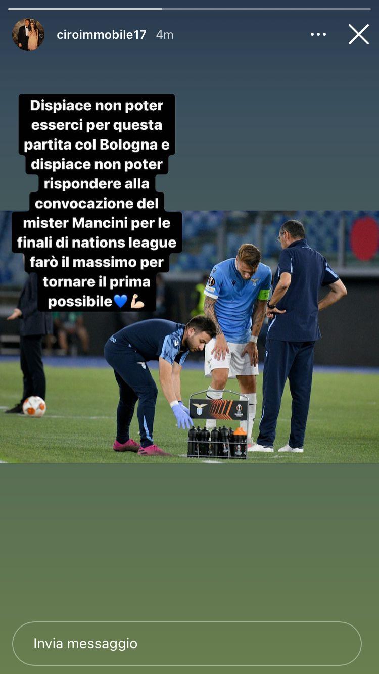 Ciro Immobile non ci sarà domani in campo contro il Bologna. I biancocelesti dovranno fare a meno di lui, l'infotunio procurato giovedì contro la Lokomotiv Mosca si è manifestato più serio di quello che sembrava. La lesione al muscolo lo terrà fuori dal campo per circa 10 giorni e non potrà nemmeno rispondere alla convocazione di Mancini in Nazionale per la fase finale di Nations League. L'attaccante ha pubblicato sul suo profilo Instagram una storia rivolta ai tifosi, scrivendo: "Dispiace non poter esserci per questa partita col Bologna e dispiace non poter rispondere alla convocazione del mister Mancini per le finali di Nations League. Farò il massimo per tornare il prima possibile".