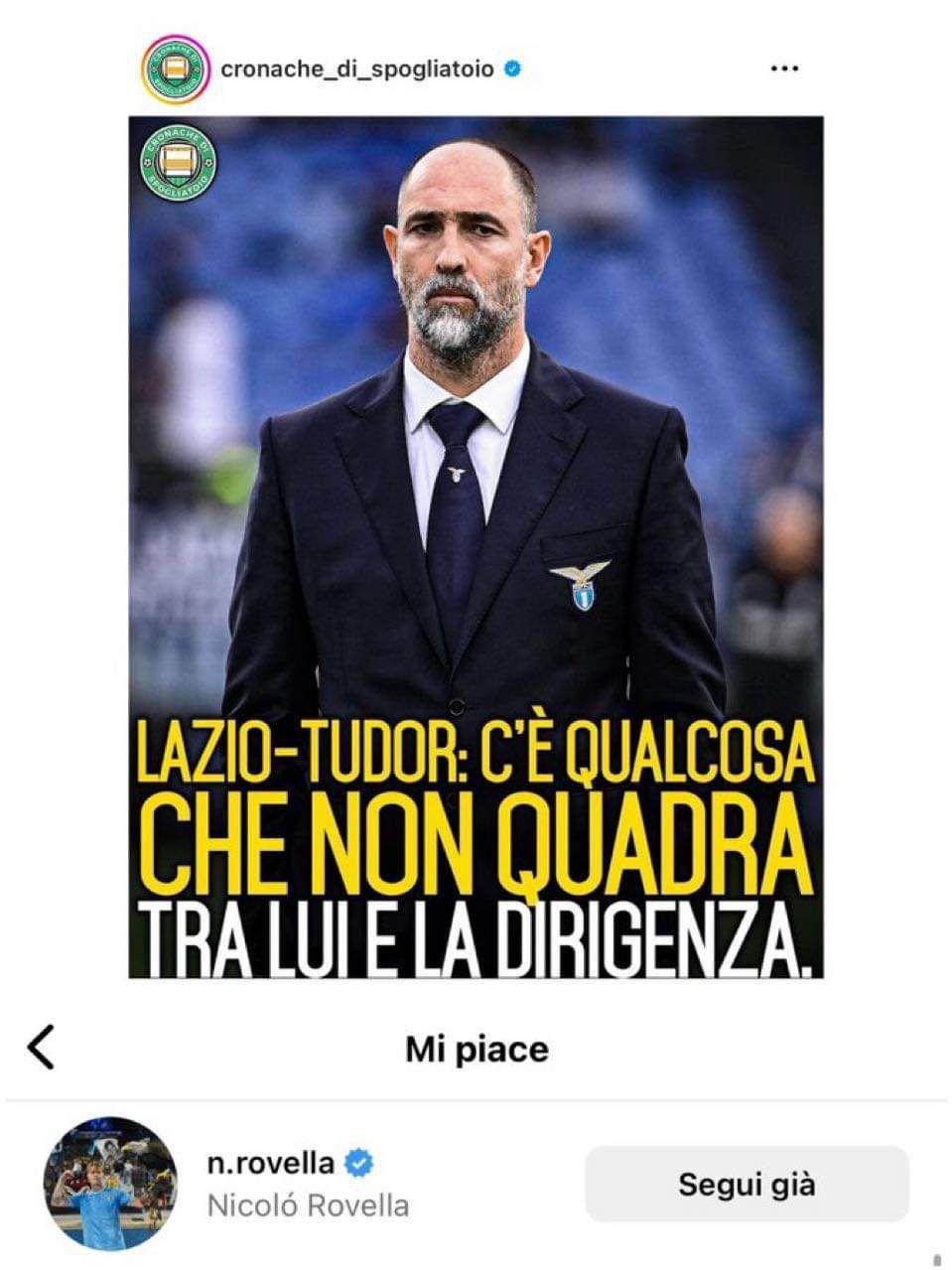 "Lazio-Tudor, c'è qualcosa che non quadra tra lui e la dirigenza". Recita così il post Instagram di Cronache di Spogliatoio, che intendeva far luce sulle voci relative a un rapporto in bilico tra l'allenatore e il club. In particolare, a un presunto colloquio con la società in merito alla composizione tecnica della squadra. Tra i vari 'mi piace', tuttavia, ne è spuntato fuori uno d'eccezione. Si tratta di quello di Nicolò Rovella, che l'ha prontamente rimosso poco dopo. Semplice errore o condivisione di un pensiero?