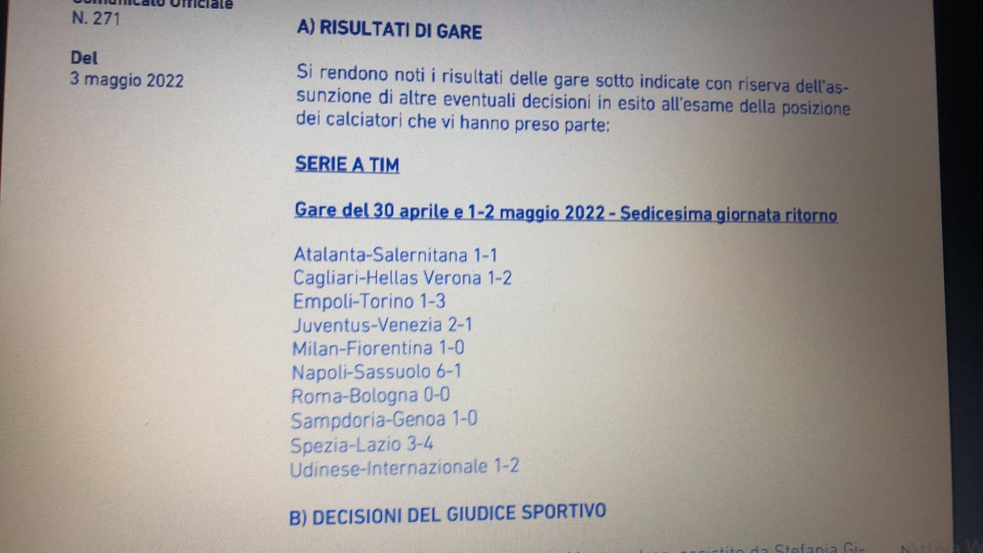 Ha fatto discutere non poco l'episodio del gol di Acerbi in fuorigioco nel match Spezia - Lazio. Dopo che il Codacons aveva annunciato di depositare il ricorso nei confronti della Lazio per far disputare di nuovo la partita non c'è però alcun scampo che questo possa avverarsi. Come già riportato dalla nostra redazione, e sottolineato dall'ex arbitro Marelli, il regolamento prevede che se un errore deriva da una decisione sbagliata che riguarda il VAR o dall'errore tecnico la partita non è invalidata e che quindi non può essere ripetuta. Non solo, se prima si faceva riferimento al regolamento adesso arriva anche l'ufficialità del Giudice Sportivo che nel comunicato relativo alla 35° giornata di Serie A ha omologato il risultato di Spezia - Lazio per 3-4. Di seguito in allegato la foto della nota della Lega di Serie A.