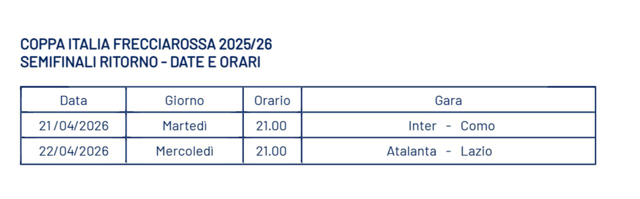 Insieme agli anticipi e i posticipi per la 31esima giornata di Serie A, sul sito della Lega è stato pubblicato il comunicato con le date delle gare di ritorno di Coppa Italia Frecciarossa: Martedì 21 aprile alle 21.00 si gioca Inter-Como, nella serata successiva, invece, è programmata Atalanta-Lazio. Dopo il 2-2 dell'andata, solamente il match di ritorno chiarirà chi, tra la formazione di Palladino e quella di Sarri, conquisterà il pass per la finale del torneo. Stessa situazione tra Como e Inter (la gara d'andata si è conclusa 0-0).