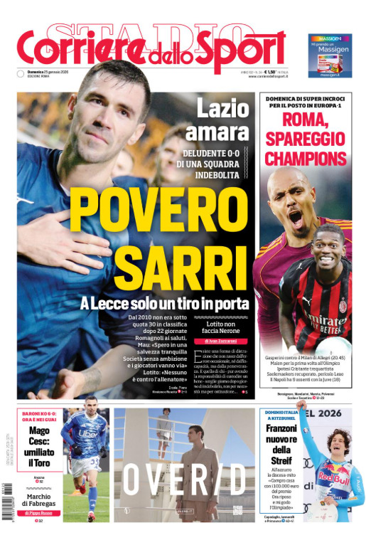 La Lazio ha deluso, ma ha qualche alibi. I pochi tiri in porta sono solo lo specchio di ciò che accade fuori dal campo. Anche il Corriere dello Sport sta dalla parte dell'allenatore e in prima pagina pubblica un gigantesco "Povero Sarri" in sua difesa. Di seguito la prima pagina del quotidiano.