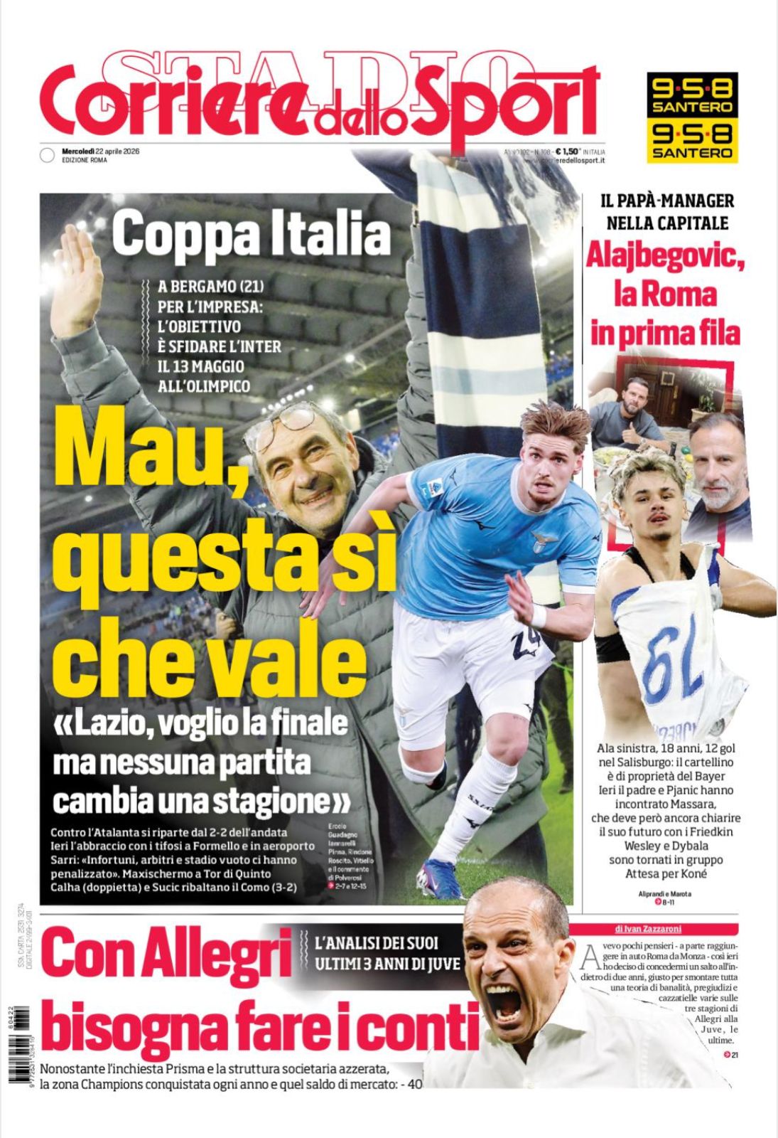 RASSEGNA STAMPA - Il Corriere dello Sport mette al centro la Lazio. Davanti ai grandi eventi non si può fare diversamente. Questa sera, alle ore 21.00, la squadra di Sarri scenderà in campo alla New Balance Arena contro l'Atalanta. Sarà il ritorno della semifinale di Coppa Italia dopo il 2-2 dell'Olimpico. Sarà come una finale. La Lazio metterà tutto in ballo.