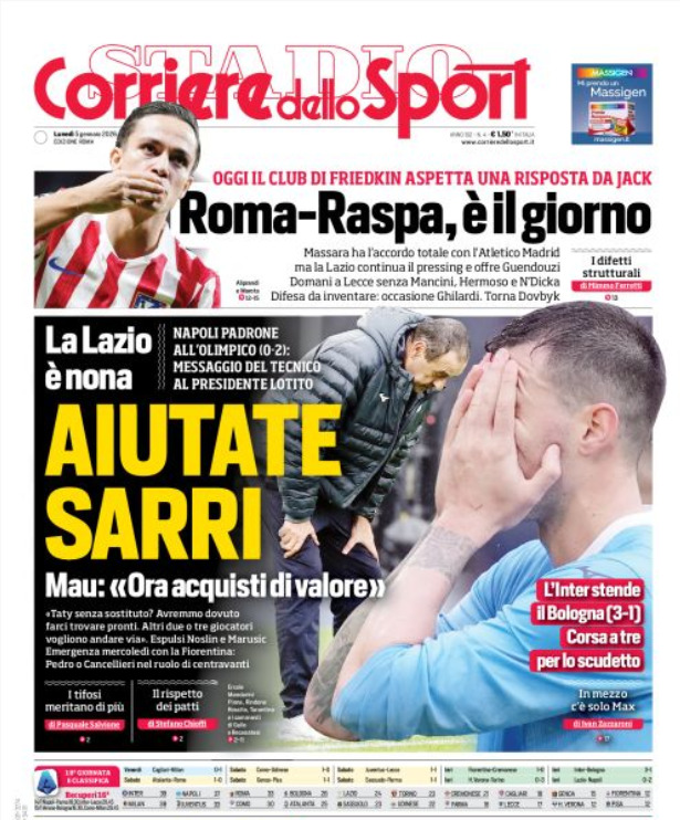 Sarri è stato chiaro, la società sa cosa serve alla Lazio e cosa il mister ha chiesto. La situazione è sotto gli occhi di tutti, ora il mercato è aperto e non è bloccato. Il Corriere dello Sport spinge in favore del Comandante e chiama la società all'azione, gridando in prima pagina un sonoro "Aiutate Sarri".