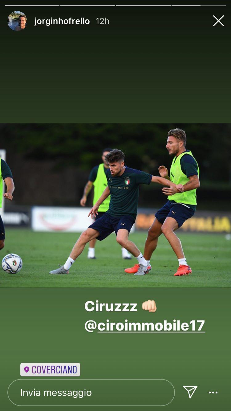 Mancano ormai poche ore al primo match della Nazionale italiana in Nations League. Questa sera, ore 21:00, gli Azzurri affronteranno la Bosnia all’Artemio Franchi di Firenze. Il gruppo di Mancini è molto unito e i calciatori lo dimostrano costantemente via social. Il centrocampista del Chelsea, Jorginho, ha pubblicato su una storia Instagram una foto con Immobile durante l’allenamento a Coverciano. L’italo-brasiliano ha aggiunto: “Ciruzz”. Il bomber biancoceleste ha ricondiviso la storia commentando: “Grande Pai”, soprannome di Jorginho dai tempi del Napoli.