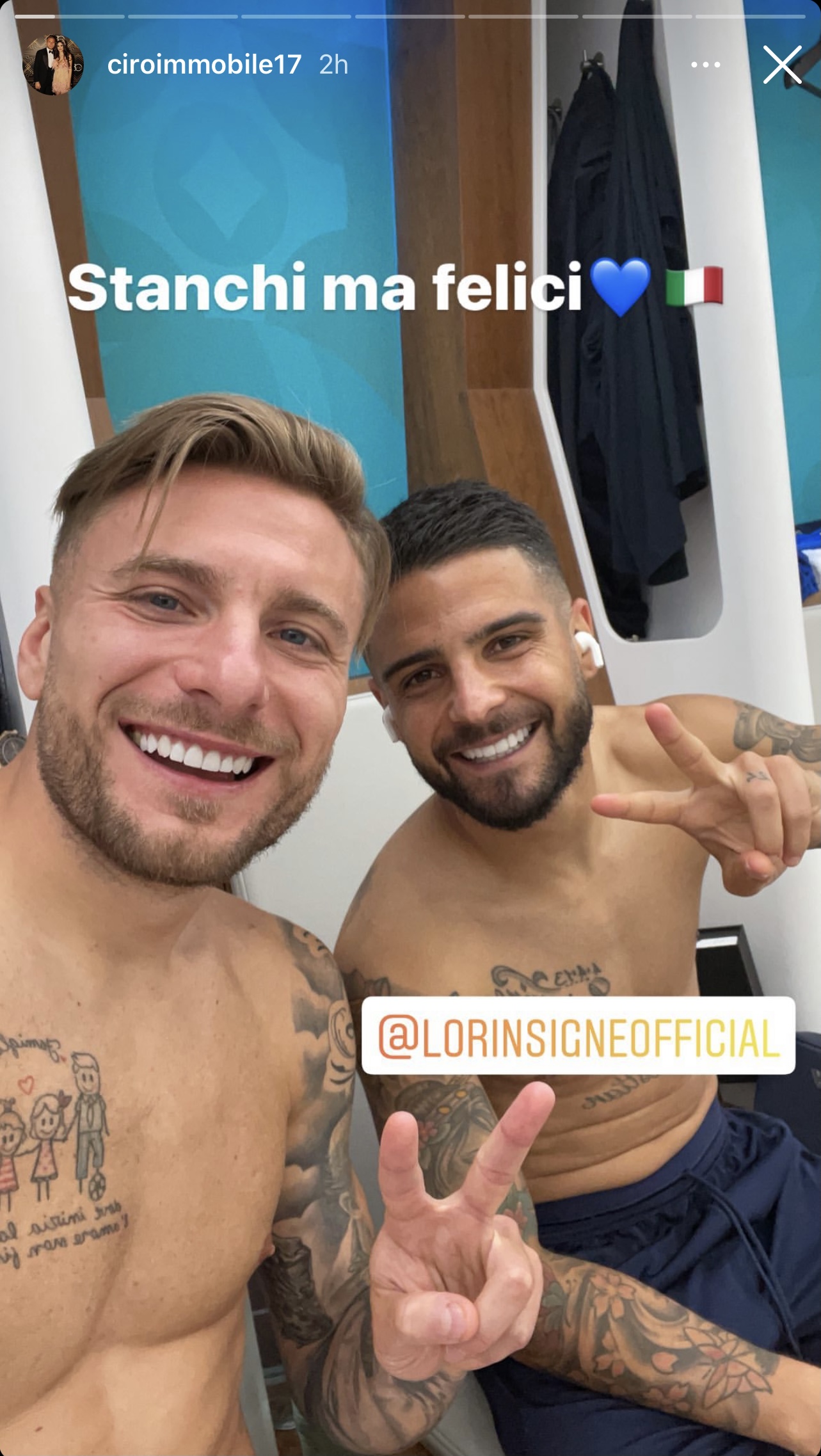 L'Italia è tra le migliori otto squadre dell'Europeo. Un ottavo di finale complicato per gli azzurri che hanno sconfitto l'Austria solo dopo i supplementari. Ad andare in gol sono stati Chiesa e Pessina, mentre Ciro Immobile è stato fermato dal palo nel primo tempo. L'attaccante ha esultato sui social dopo il match scrivendo: "L’obiettivo è rendervi orgogliosi di noi, nonostante le difficoltà, l’emozione non abbiamo mollato. Bravi ragazzi avanti così azzurri". Tra i commenti spunta anche quello di Joaquin Correa che ha scritto: "Grande Ciroooo". Il bomber di Torre Annunziata ha poi postato una storia di un seflie con Lorenzo Immobile. Il bomber della Lazio ha scritto: "Stanchi ma felici".