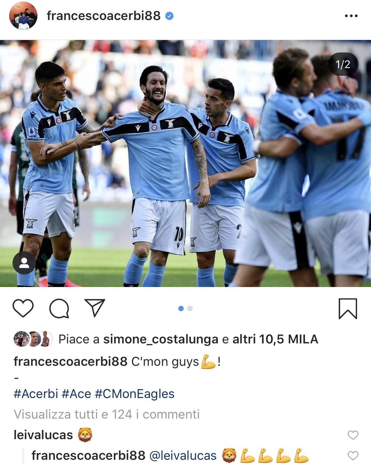 La Lazio batte il Bologna inanellando il ventunesimo risultato utile consecutivo e agguantando il primo posto in classifica, in attesa del recupero tra Juventus e Inter. Tra i biancocelesti era assente Francesco Acerbi, bloccato da un problema al muscolo soleo accusato la scorsa settimana e accentuatosi nel riscaldamento pre Genoa. Il difensore ha esultato per il successo dei compagni e ha condiviso la foto dell'esultanza accompagnata dalla frase "C'mon guys". Immediati i like dei compagni con Lucas Leiva che ha anche commentato con l'emoticon del leone (soprannome di Acerbi). Il gruppo è la forza di questa squadra che rema tutta dalla stessa parte, verso lo Scudetto.