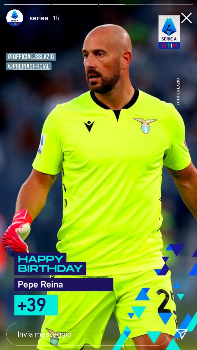L’estremo difensore della Lazio compie gli anni oggi, 39 candeline per la precisione. Agli auguri del club e del capitano biancoceleste, non potevano mancare quelli della Serie A. Pepe Reina è un valore aggiunto alla Lazio e in generale per il campionato, data la sua esperienza professionale che lo precede per questo è stato molto ben gradito il suo ritorno nella massima serie italiana. Il profilo Instagram della Serie A ha pubblicato con una insta stories i propri auguri per il portiere.