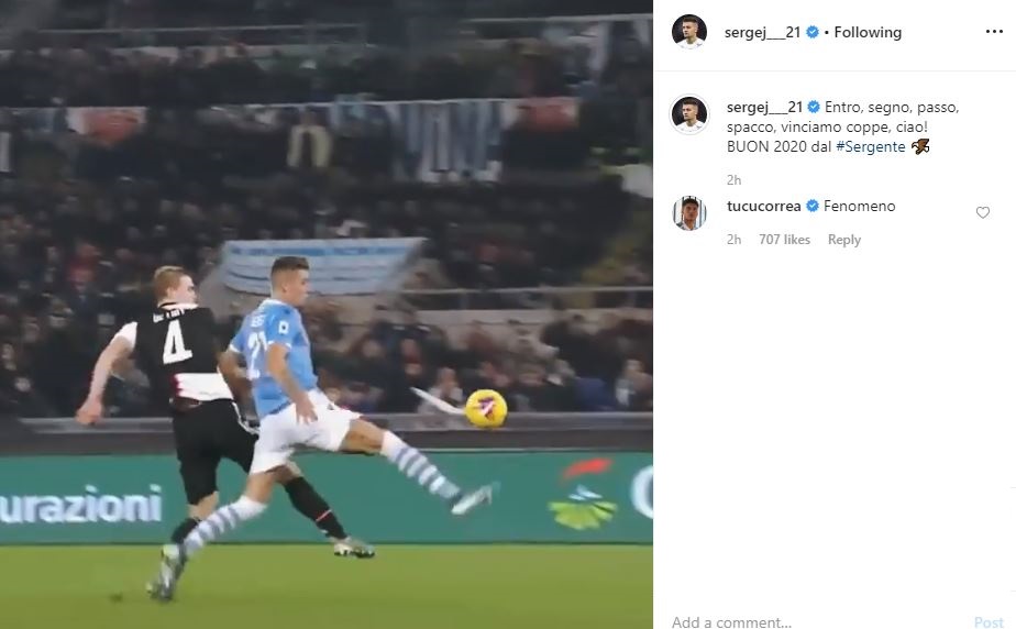 Parafrasando Salmo - “Entro, spacco, esco, ciao” -, nascono nuovi neologismi da Sergente. Non poteva mancare il suo augurio di buon anno nuovo. Il 2020 nel quale Milinkovic promette di continuare a fare quel che più gli riesce meglio: “Entro, segno, passo, spacco, vinciamo coppe, ciao! Buon 2020 dal Sergente”, scrive su Instagram. Nel video a ornamento del post si possono riammirare tre dei momenti più importanti del suo 2019. Il gol in finale di Coppa Italia - dove in effetti entra e segna dopo 3' minuti -, quello alla Juventus all'Olimpico dello scorso 7 dicembre e poi l'assist a Luis Alberto per aprire il tabellino in Supercoppa. E sotto Correa lo incensa: "Fenomeno". Insomma, se il buon anno si vede dal mattino, questo ha l'oro dei trofei in bocca.