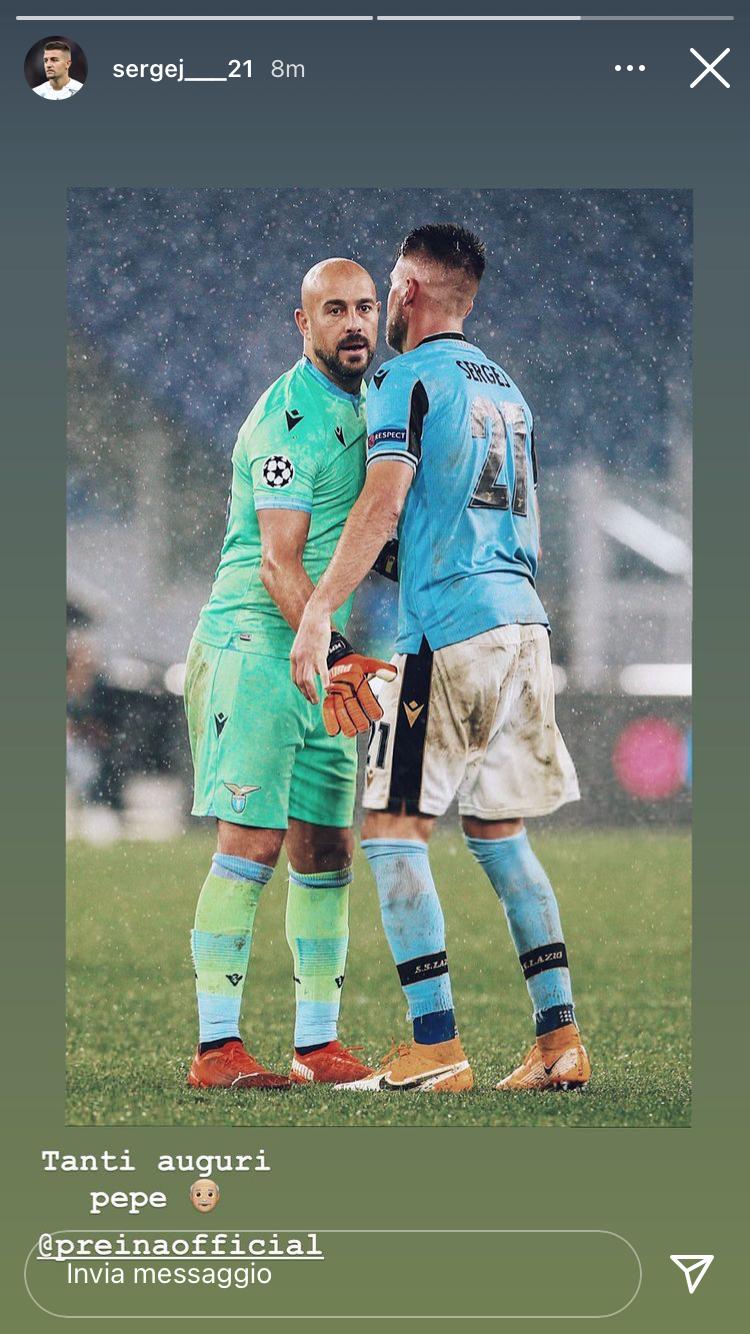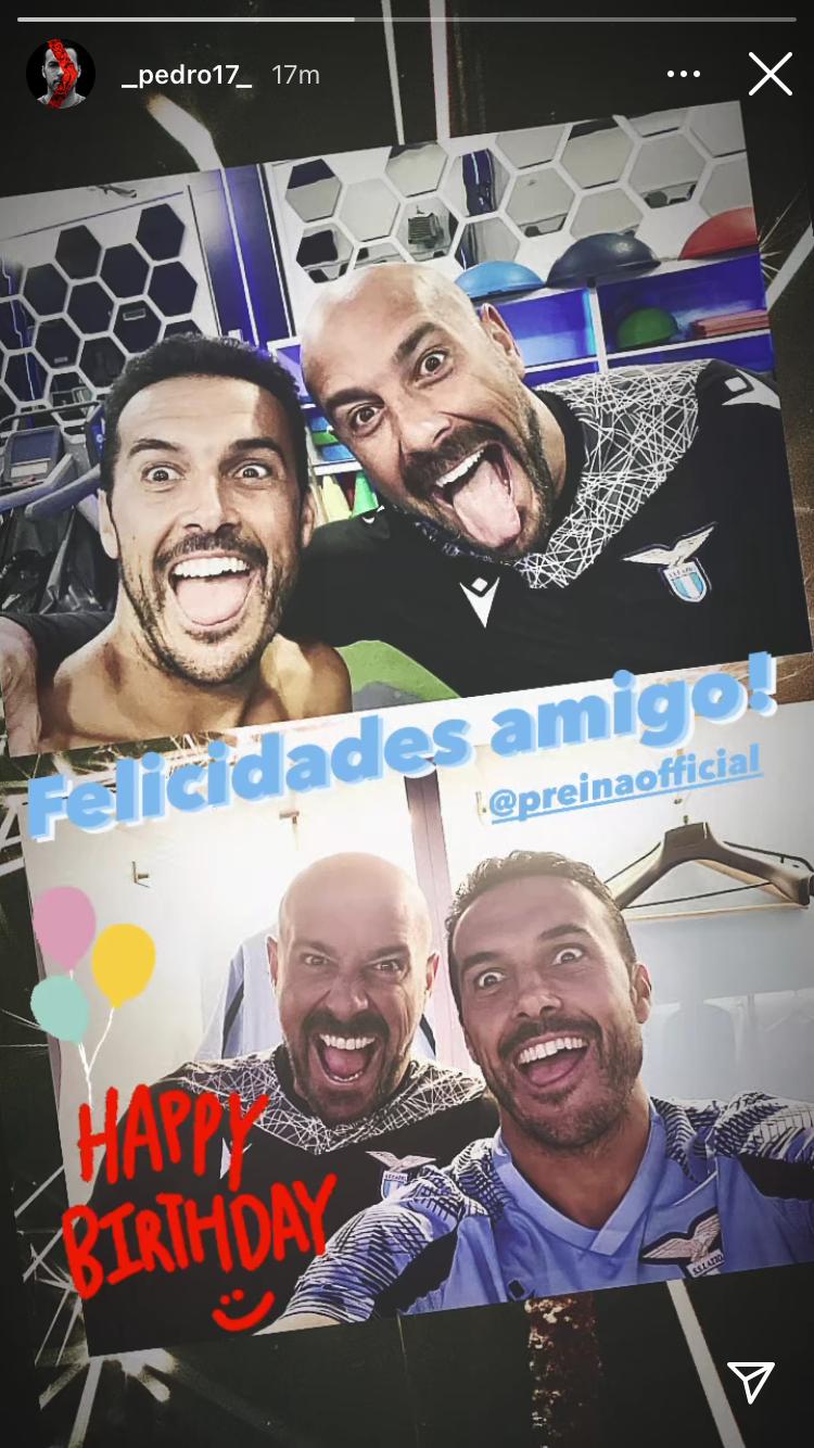 Ondata di affetto in questo giorno speciale per Pepe Reina. Diversi i messaggi di auguri da parte dei suoi compagni che non risparmiano all’estremo difensore biancoceleste parole di stima. Sergej Milinkovic Savic ha pubblicato sul suo profilo Instagram ufficiale tramite una story, una foto che li ritrae insieme in un momento di intesa sul campo e la dedica: “Tanti auguri”. Si accoda il nuovo arrivato Pedro, compagno di nazionale di Pepe, anche lui con una story ha pubblicato uno scatto in cui sono insieme: “ Buon compleanno amico”.