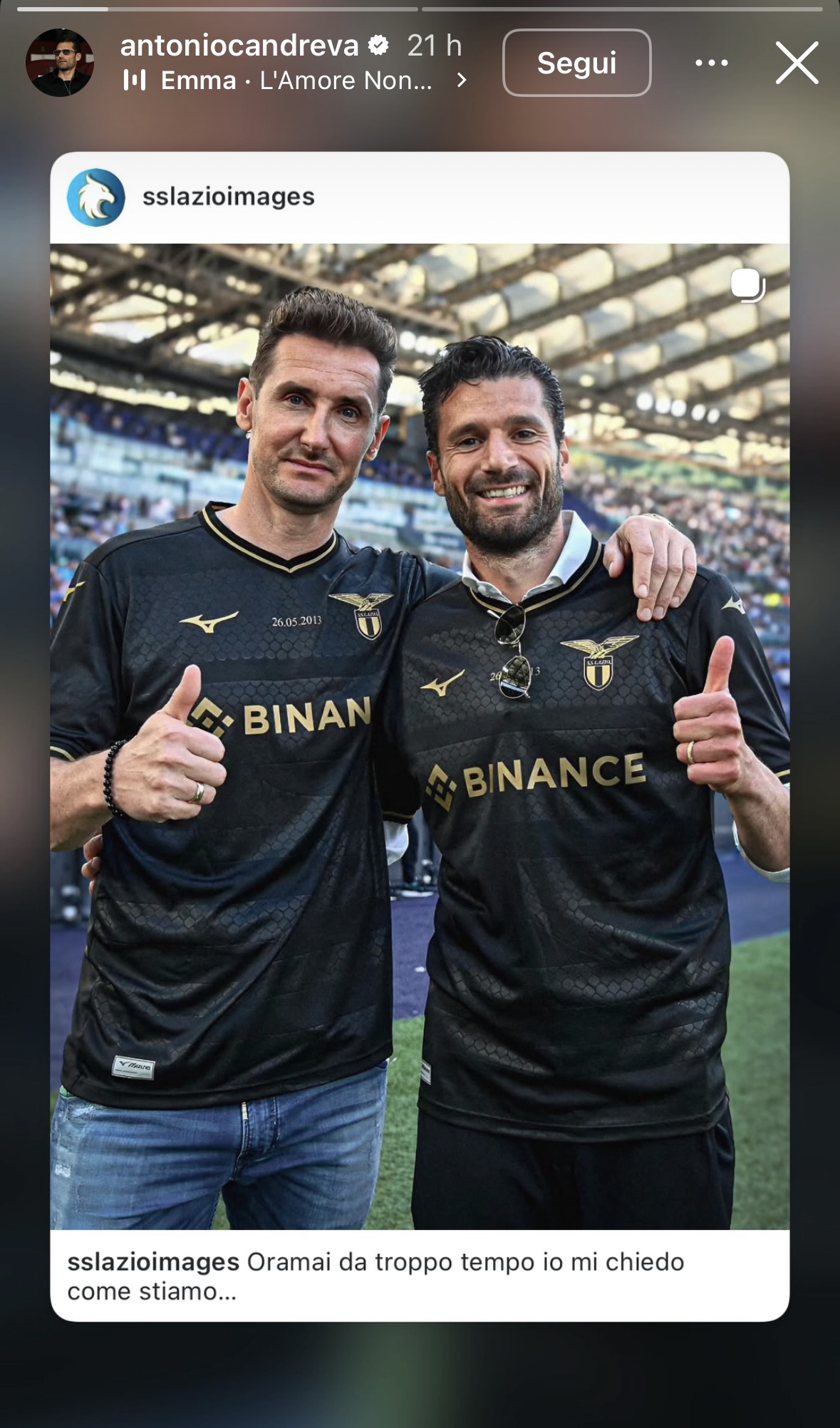 Candreva, infatti, ha ricondiviso una foto che lo ritrae sul rettangolo di gioco con Miroslav Klose, entrambi con indosso la speciale maglia realizzata dalla Lazio per i 10 anni dal trionfo sulla Roma.