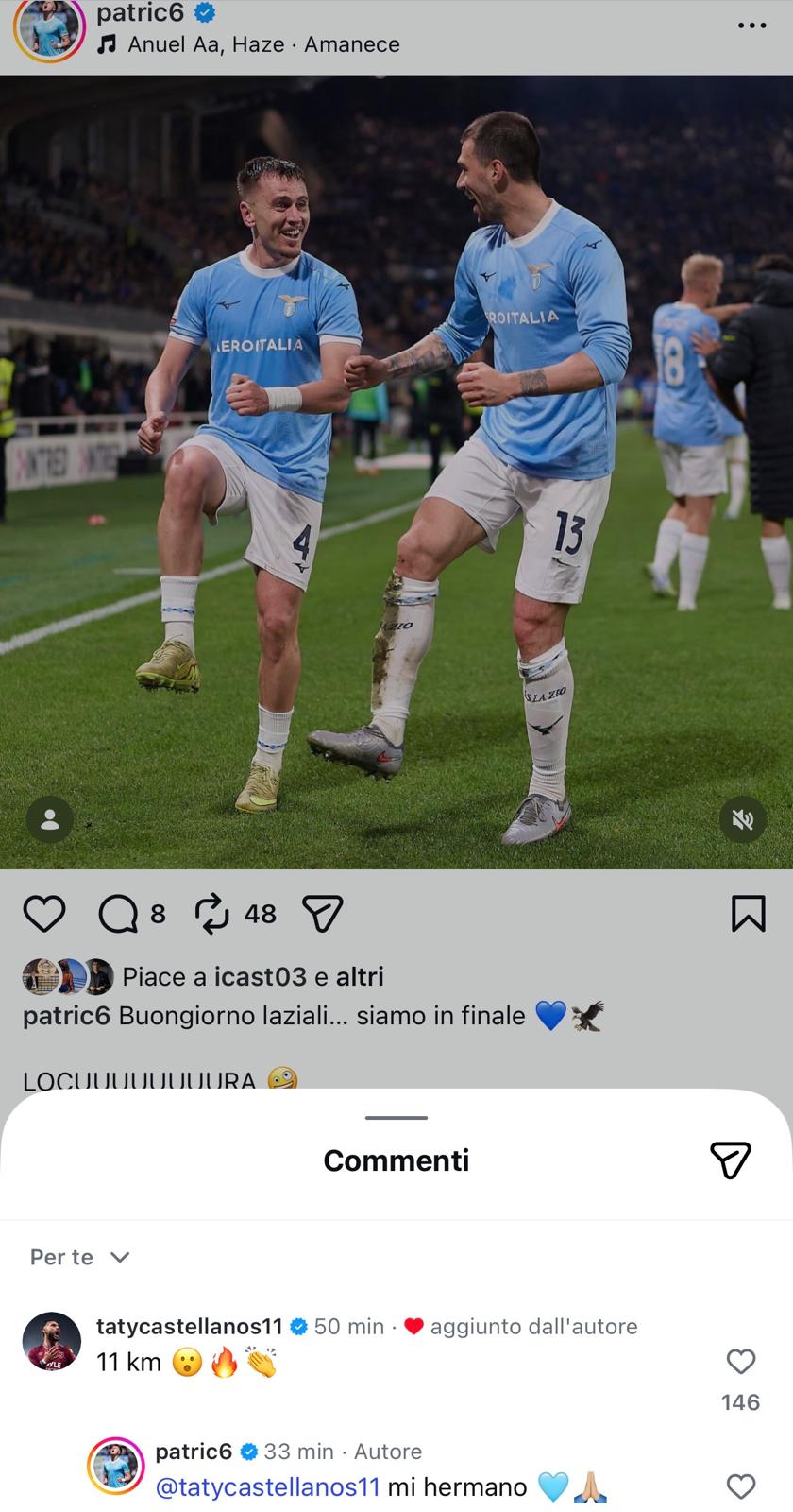 I complimenti allo spagnolo sono arrivati anche da un ex compagno alla Lazio. Sotto il post pubblicato sui social dallo stesso Patric, infatti, è apparso il commento di Castellanos: “11 km” con tanto di applausi, a cui il calciatore bianccoeleste ha risposto con un “Mi hermano”. Anche a distanza, il Taty continua a seguire da vicino le sorti dei biancocelesti.