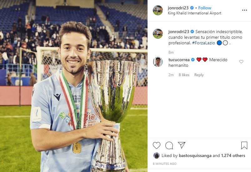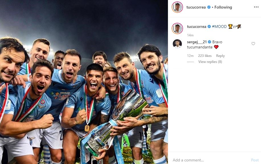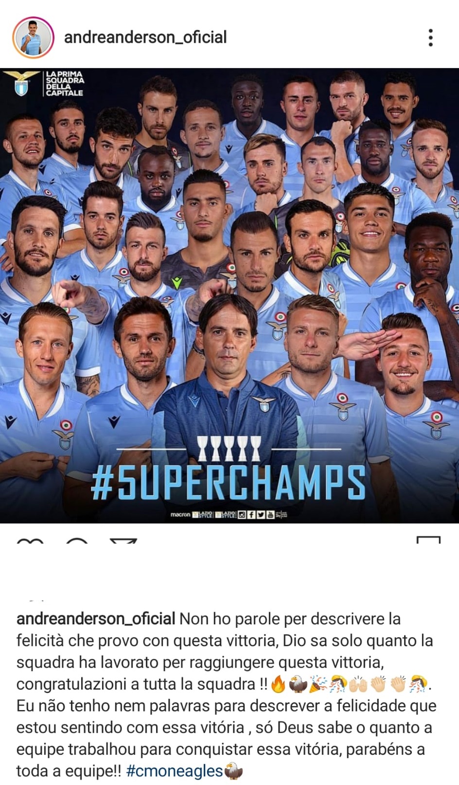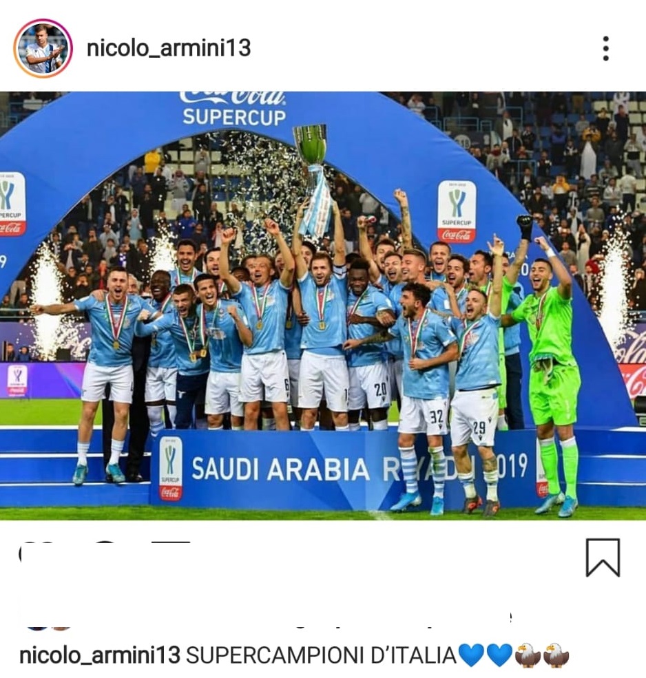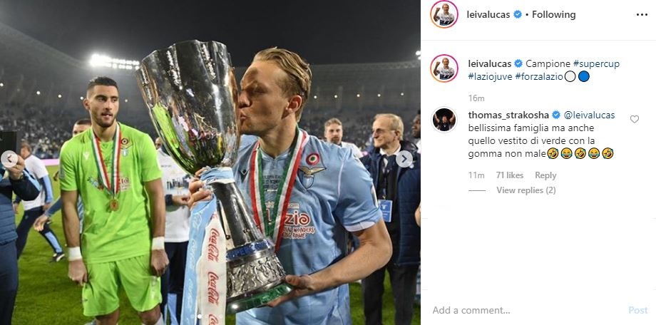 Ora per le strade di Roma, in mattinata a Fiumicino. La Lazio si sta preparando alla festa con i suoi tifosi. Omaggio dovuto a una squadra che sta volando, letteralmente e non, da Riyad alla Capitale con la Supercoppa in braccio. Un trofeo che in tanti hanno coccolato sui rispettivi profili social. Tra chi scrive messaggi profondi come André Anderson - “Non ho parole per descrivere la felicità che provo. Dio solo sa quanto la squadra ha lavorato per raggiungere questa vittoria” -, c'è chi sta vivendo un sogno: “Ce l'abbiamo fatta. Siamo un Dream Team”, scrive Adekanye. Sedicesimo trofeo in carriera per Silvio Proto, mentre quelle araba sono sensazioni del tutto nuove per Jony, al suo primo titolo da professionista. Milinkovic invece la butta in politica. Da buon Sergente, il serbo resta fedele al suo leader: “Bravo Tucumandante”. Che altri non è che Joaquìn Correa. Grande felicità anche per Berisha e Armini, due che sognano un futuro da protagonisti in questa Lazio. Chi protagonista lo è - a malgrado di Lucas Leiva - è invece Thomas Strakosha, vero e proprio photobomber degli scatti del brasiliano: “Bellissima famiglia, ma anche quello vestito di verde con la gomma non è male”. Inutile dire chi fosse. Lo stesso portiere albanese si è poi vantato della vittoria sulla sua pagina: “Ne mettiamo un'altra in bacheca”. Semplicemente “Campioni”, chiude Cataldi. Sui social come in Juventus - Lazio, l'ultima parola appartiente sempre a Danilo.