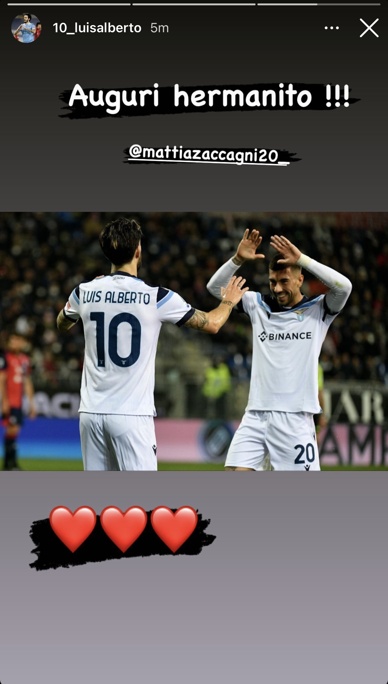 Dal Mago all'Arciere, dalla bacchetta alle frecce, dal numero 10 al 20. Luis Alberto fa gli auguri a Mattia Zaccagni via social. Il fantasista spagnolo, infatti, ha pubblicato tra le Instagram stories uno scatto con il suo compagno di squadra che oggi spegne 27 candeline. Due pilastri di Sarri che in campo parlano la stessa lingua e che hanno dato una grande mano al Comandante in questo primo anno biancoceleste. Il centrocampista andaluso ha inoltre aggiunto una dedica a tutta in spagnolo per Zac: "Auguri fratellino".