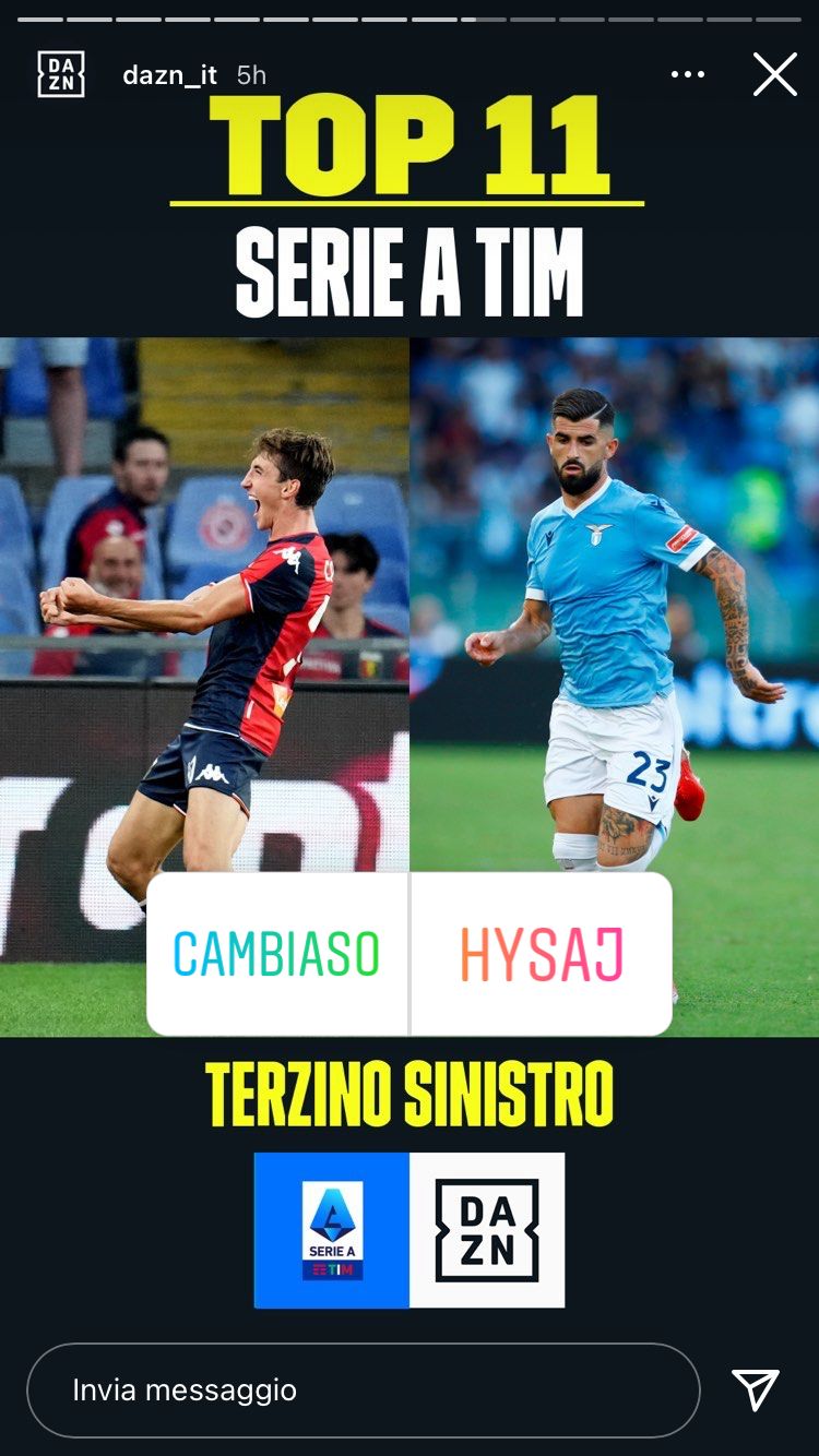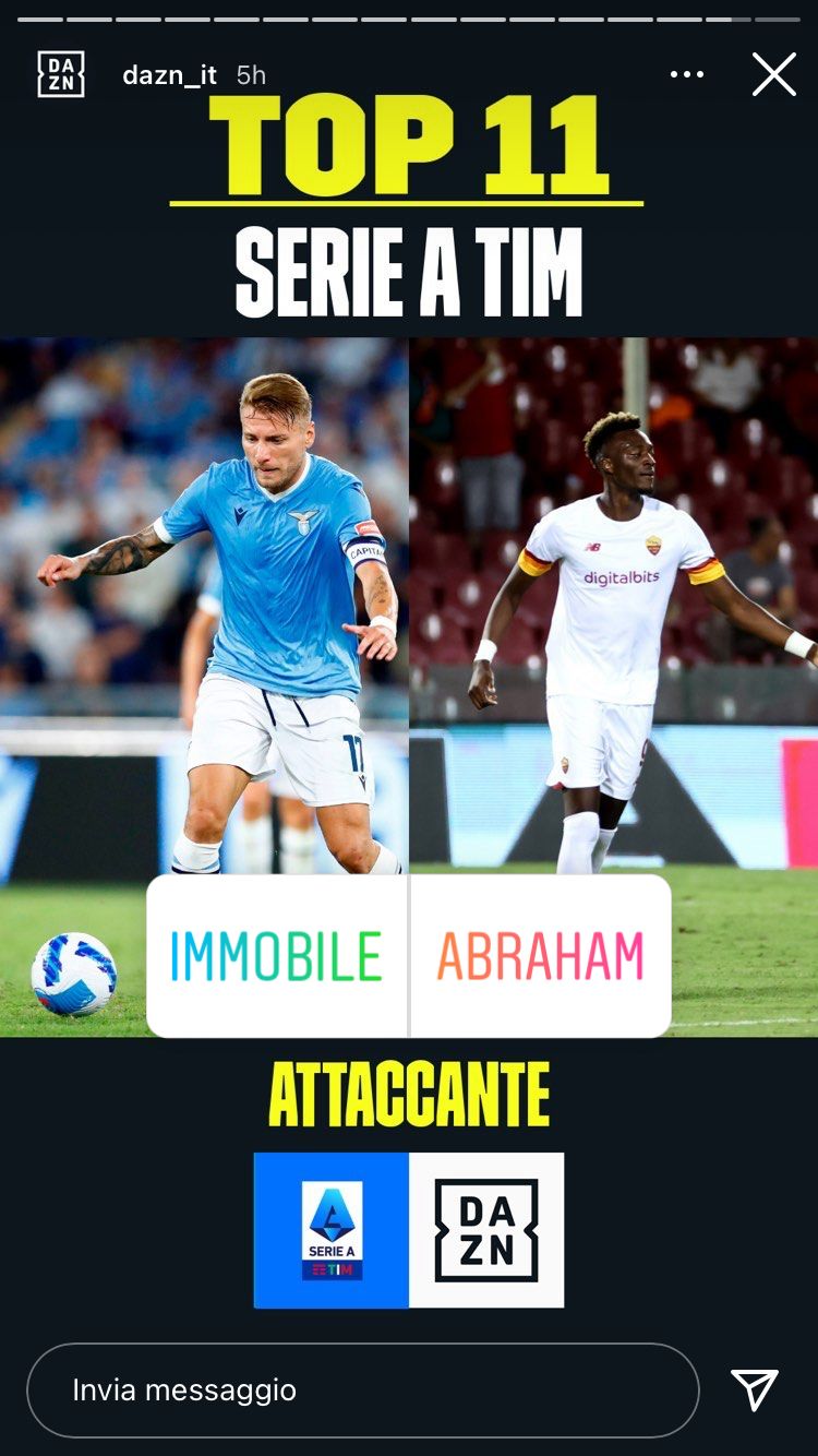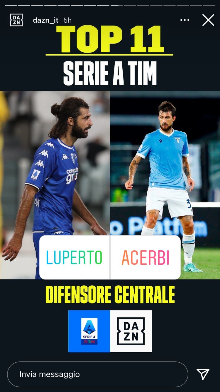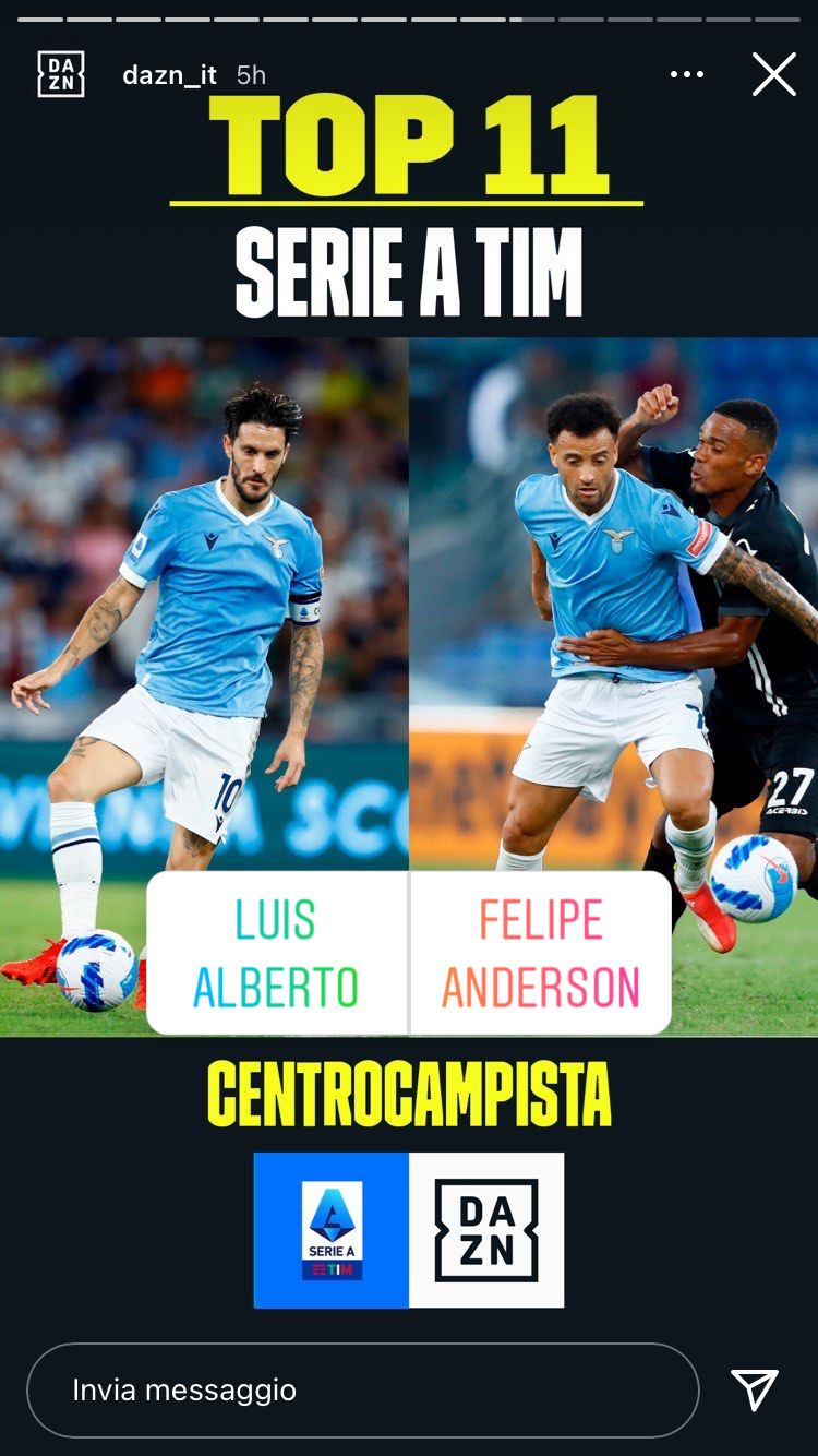 Si è concluso il secondo weekend di Serie A, è tempo di tirare le somme per decretare i migliori in campo di tutte le squadre. La Lazio è reduce dalla seconda vittoria consecutiva, i numeri dei biancocelesti non sono passati inosservati tanto da essere coinvolti nell'ennesimo sondaggio. A lanciarlo questa volta è Dazn sul suo profilo Instagram, attivando la votazione nelle storie per decretare la Top 11 della settimana. Tra le opzioni ci sono 5 biancocelesti. Per la difesa Francesco Acerbi si contende il posto con Luperto, per i terzini la scelta è tra Hysaj e Cambiaso, per il centrocampo è tra Luis Alberto e Felipe Anderson, infine per l’attacco è duello tra Ciro Immobile e Tammy Abraham. Via alla votazione!