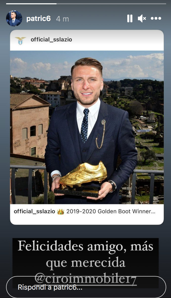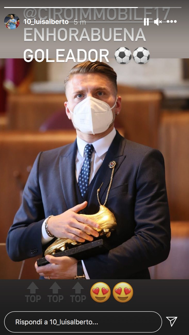 Arrivano anche i complimenti dopo la consegna del premio al Campidoglio a Ciro Immobile, dei suoi compagni di squadra. Il primo è stato Luis Alberto, che su Instagram ha omaggiato così attraverso una storia il bomber biancoceleste: "Congratulazioni goleador ". Ad unirsi al coro poi anche Patric, sempre attraverso una storia: "Felicitazioni amico, più che meritato ".
