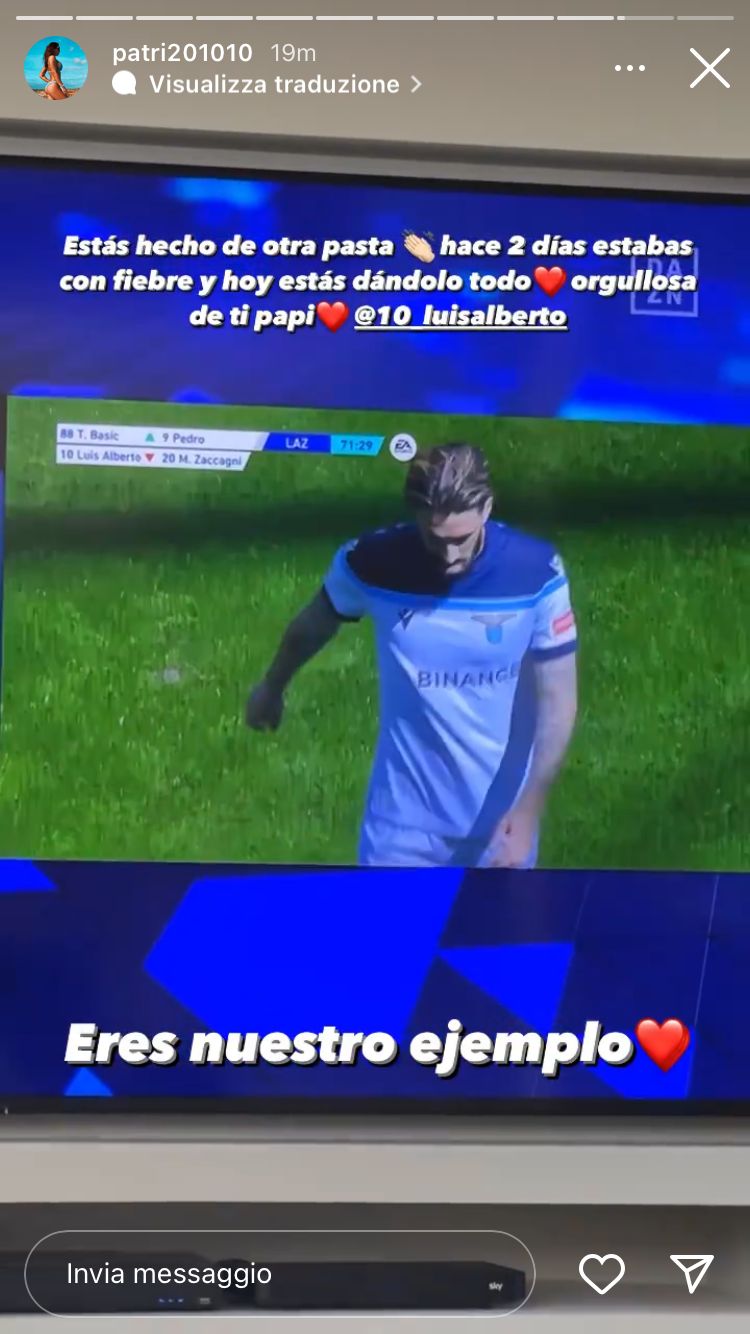 La Lazio esce vincente dal match contro il Genoa, la rete di Marusic e la tripletta di Ciro Immobile hanno regalato alle aquile punti preziosi per la corsa all’Europa. Tra i protagonisti in campo anche Luis Alberto, lo spagnolo non ha svolto la preparazione completa nel corso della settimana aggregandosi ai compagni solo qualche giorno prima della sfida. Aveva destato preoccupazione la sua assenza soprattutto dopo gli indizi social della moglie Patricia, relativamente allo stato di salute dei figli. Niente di preoccupante per il Mago, fortunatamente, che oggi è stato schierato in campo dal 1’. È molto fiera e orgogliosa di lui Patricia, lo ha ribadito sui social attraverso una story su Instagram. Queste le sue parole: “Sei fatto di un’altra pasta. Due giorni fa avevi la febbre e oggi stai dando tutto. Orgogliosa di te. Sei il nostro esempio”. A questa si aggiunge l’esultanza per la vittoria: “La mia Lazio”.