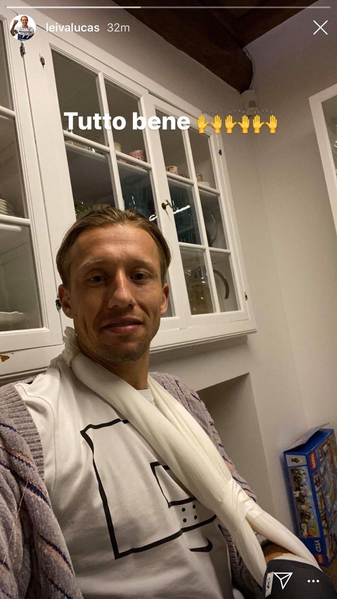 Fiato sospeso per tutti i tifosi della Lazio, oggi Leiva è stato sottoposto a un intervento chirurgico per una lesione del pollice. Tutto è andato bene, ora il brasiliano sarà monitorato quotidianamente. Nulla di grave, il saggio del centrocampo biancoceleste non dovrebbe avere problemi e sarà di nuovo in campo contro il Napoli, con ogni probabilità munito di tutore. Su Instagram proprio Leiva stesso ha voluto tranquillizzare i tifosi: "Tutto bene!", recita la didascalia che lo ritrae con l'ingombrante fasciatura che avvolge il braccio.