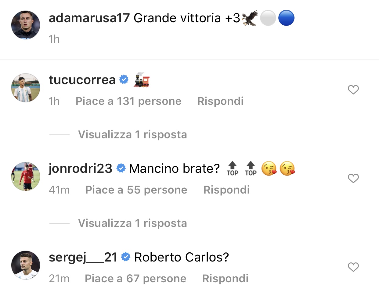 LAZIO SOCIAL - La Lazio torna a vincere all'Olimpico, con una prova super convincente stende il Napoli e si rilancia. Una dimostrazione importante quella delle aquile che porta morale e punti alla squadra di Inzaghi. Adam Marusic è stato tra i protagonisti del successo con una prestazione ben oltre la sufficienza: attento in fase difensiva e penetrante in fase offensiva. Proprio dal suo cross è nata la rete del vantaggio di Immobile. Il montenegrino ha esultato sui social postando la foto di ieri accompagnate dal messaggio: "Grande vittoria! +3". Immediate sono arrivate le reazioni dei compagni di squadra che hanno ironizzato sul fatto che il cross disegnato dall'esterno sia stato fatto con il piede sinistro. Marusic, infatti, è un esterno destro che per necessità (a causa degli infortuni di Fares e Lulic) si è adattato sull'out opposto. Così Correa ha commentato con l'emoticon del treno, mentre l'ex Jony ha scritto: "Mancino fratello?". Ancora più divertente il commento di Sergej Milinkovic Savic, grande amico di Adam con cui condivide anche il procuratore, che ha scritto: "Roberto Carlos".