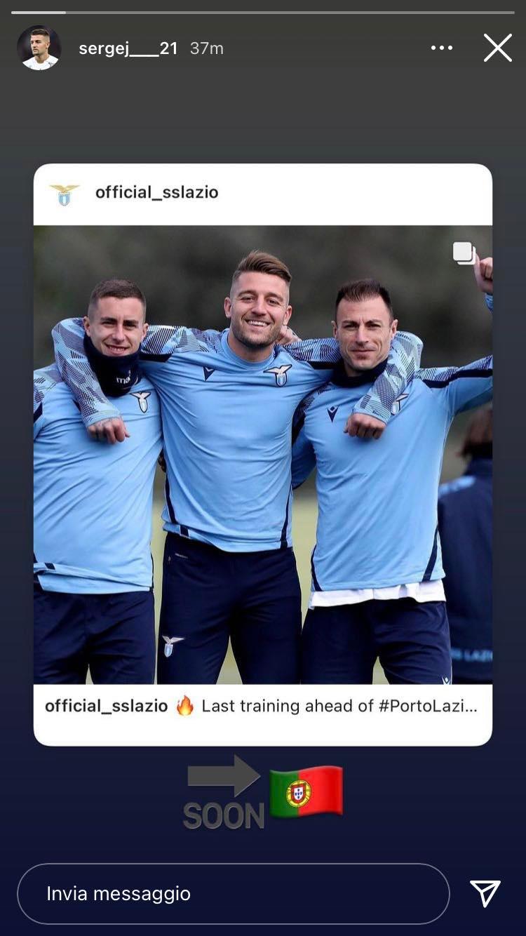 Poco più di 24 ore, l'adrenalina è a mille. Porto - Lazio, partita valida per i sedicesimi di finale di andata di Europa League. Le luci dell'Estádio do Dragão sono prossime ad illuminare il big match, uno dei più importanti della stagione della Lazio. Maurizio Sarri e i suoi dovranno tener conto dell'assenza di Ciro Immobile alla cui partita non prenderà parte. Tra i leader in squadra però c'è anche il vice capitano Sergej Milinkovic-Savic che già ha messo nel mirino la sua prossima avversaria. Sarà un duello all'ultimo sangue per il Sergente. Nelle storie di Instagram ha già puntato il Porto mettendo la foto della rifinitura con Marusic e Radu accompagnata da un'emoji che indica "soon" (presto) e la bandiera del Portogallo. Non resta che aspettare le ultime battute finali prima di godersi lo show...