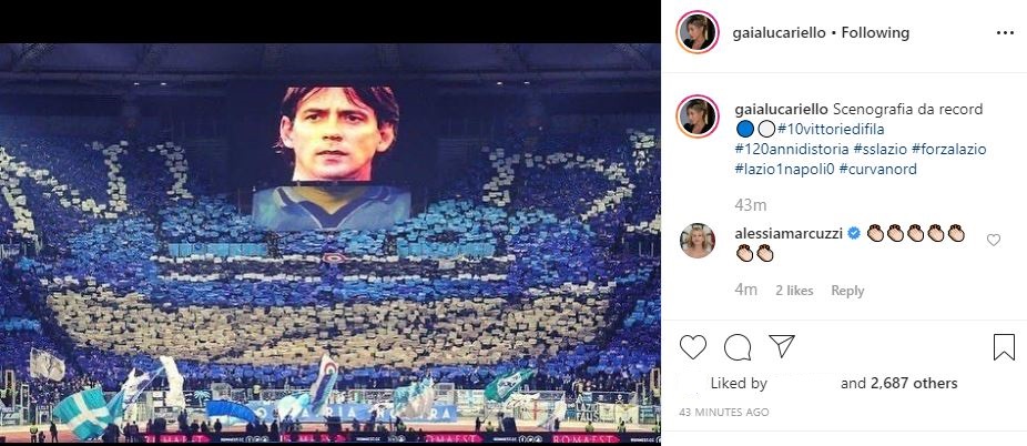 Lazio - Napoli, spettacolo sul campo e sugli spalti. Quello che più ha sbalordito le ladies biancocelesti. Sbalordito ed emozionato, come nel caso di Gaia Lucariello. Tra i personaggi più importanti della storia della Lazio proiettati sul maxi-schermo, non poteva mancare suo marito: Simone Inzaghi. L'uomo dei primati infranti, laziale tra i laziali: “Scenografia da record”, scrive Gaia. Mentre la dolce metà di Caicedo, Marìa Garcìa, si limita a filmare estasiata lo spettacolo della Nord. Un'altra prestazione importante per Danilo Cataldi, entrato dalla panchina ma come sempre prezioso. L'orgoglio di sua moglie Elisa e del piccolo Tommaso: “Bravo papà”. Bravo anche Ciro Immobile. Autore del gol decisivo, celebrato da sua moglie Jessica che posa con sullo sfondo l'Olimpico a fine partita. Con le mani fa il segno della “V”: come vittoria, come venti. I gol in campionato del bomber di Inzaghi. Lazio - Napoli, un'altra serata da incorniciare anche per le ladies del mondo biancoceleste.