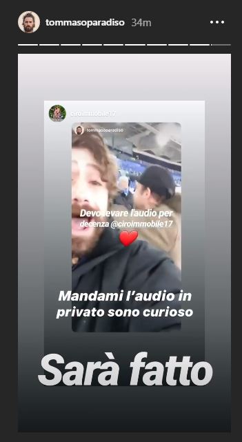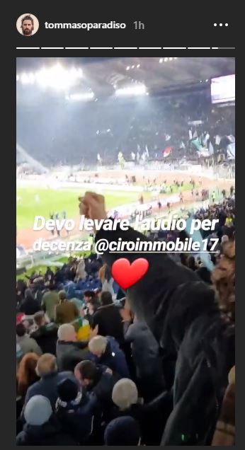 Un cantante...muto. Come la sua storia di Instagram pubblicata a margine dell'1-0 di Ciro Immobile. Tommaso Paradiso si è auto-censurato. Probabilmente non l'ha fatto per negare a tutti l'acuto migliore della sua carriera, né per non svelare il ritornello della sua prossima hit. L'urlo al gol del bomber della Lazio dev'essere stato spacca-timpani, un ruggito da infrangere la barriera del suono: “Devo levare l'audio per decenza”, ha scritto il lazialissimo cantante a corredo del video della propria esultanza dagli spalti dell'Olimpico. Poi Immobile risponde: “Voglio l'audio in privato” - “Sarà fatto”, sentenzia Paradiso. Però Ciro, copriti le orecchie.