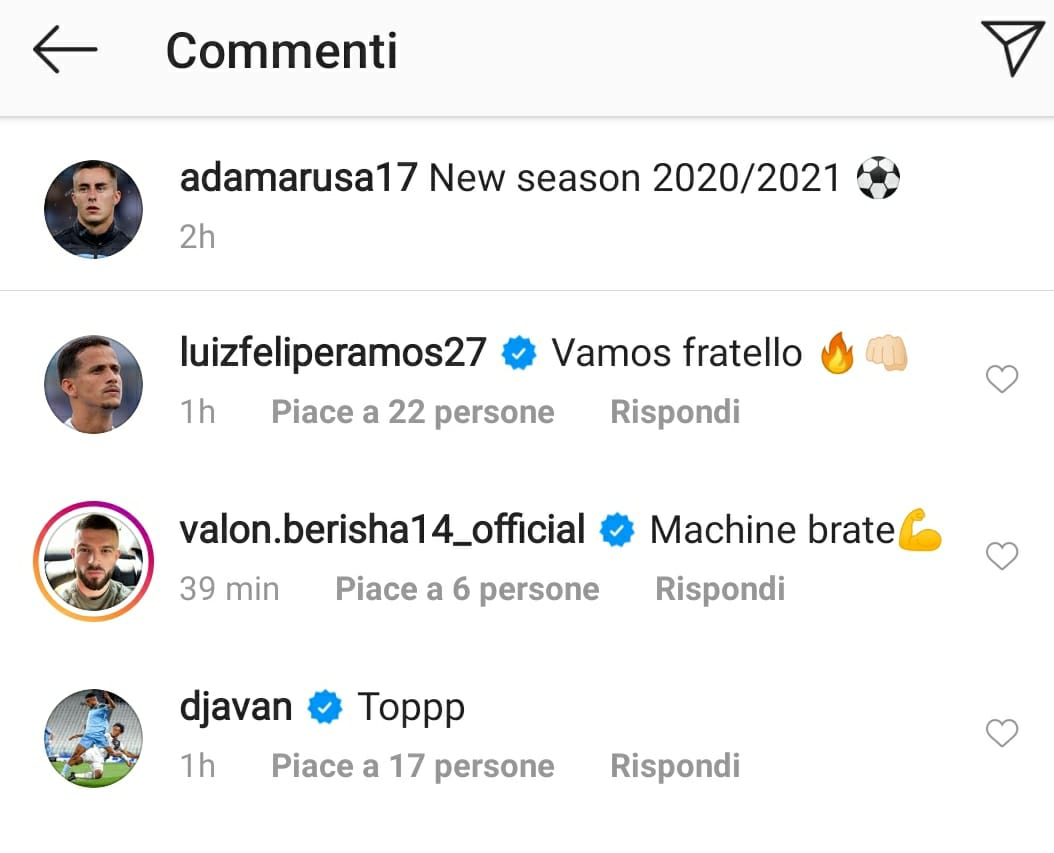 La stagione 2020-21 della Lazio si è aperta con i test medici e fisici, in attesa della partenza per Auronzo di lunedì. Adam Marusic su Instagram ha postato delle foto delle prime sgambate al Training Center di Formello, che hanno ricevuto commenti da parte di compagni ed ex. Luiz Felipe, Djavan Anderson, ma anche Valon Berisha (oggi allo Stade Reims) hanno incitato l'esterno biancoceleste: "Forza fratello!". Sarà una stagione importante con il ritorno in Champions League, la Lazio vuole gettare le basi fin da subito.