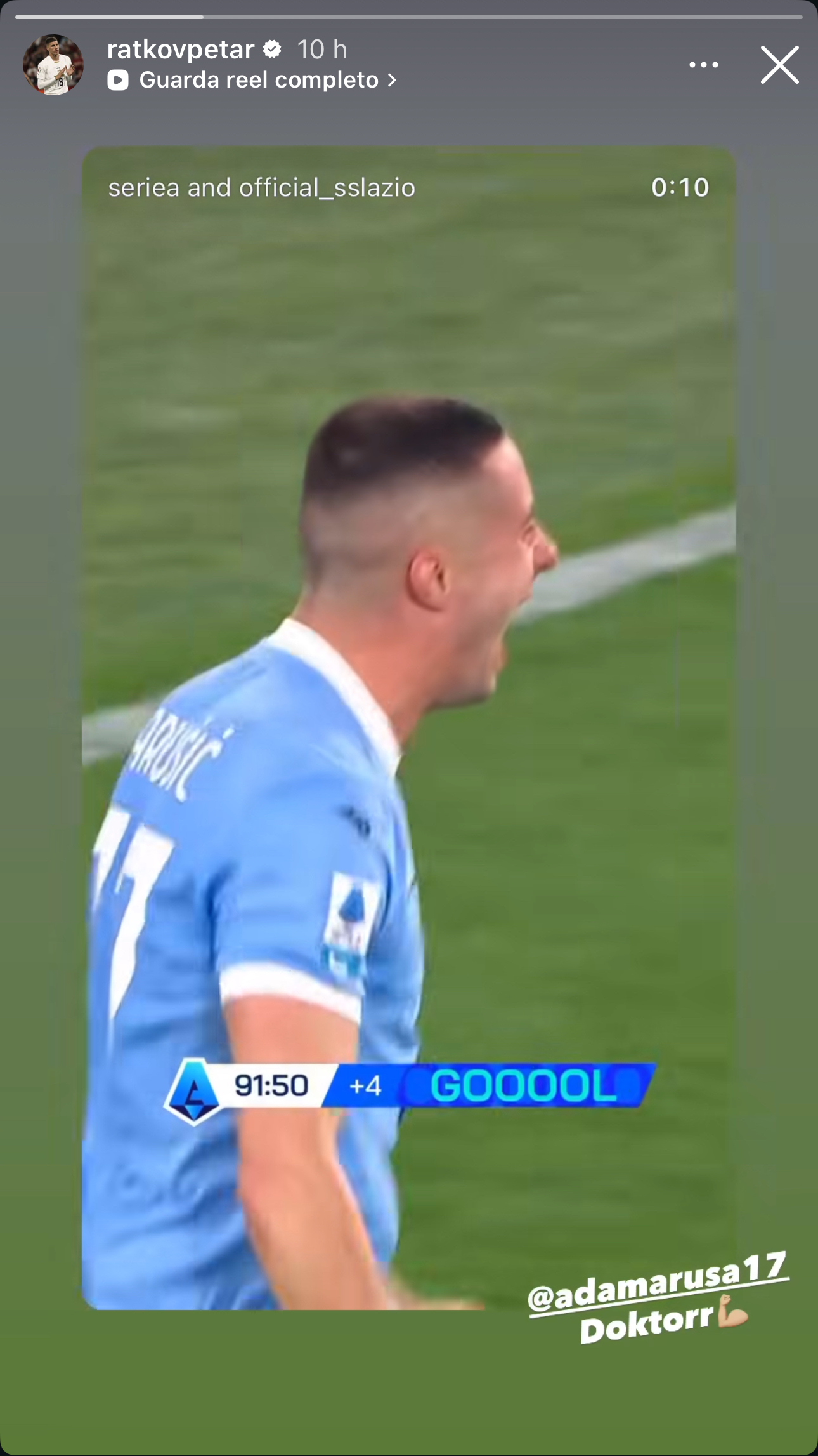 Un gol che vale i tre punti e che ha permesso alla Lazio di tornare a vincere tra le mura amiche. È pesantissima la rete realizzata da Adam Marusic, bravo a sfruttare un’uscita fin troppo allegra di Muric e a regalare un successo che ai biancocelesti mancava ormai da troppo tempo. Esplosiva l’esultanza di Sarri e della squadra subito dopo il gol, con il montenegrino che è stato poi celebrato da diversi post e storie social. Tra queste anche quella di Petar Ratkov: l’attaccante della Lazio ha infatti rincondiviso il video dell’esultanza congratulandosi con il compagno di squadra. Di seguito la foto.