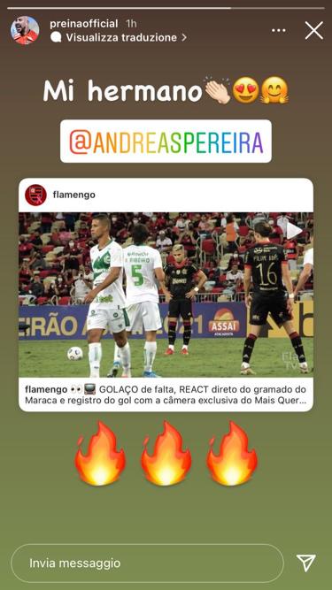 Dopo Lucas Leiva anche Pepe Reina si complimenta con Andreas Pereira per il gol segnato nella sua ultima partita. Il portiere della Lazio ha condiviso tramite una storia su Instagram il video del gol e ha scritto: “Mio fratello” con l’emoticon delle mani che applaudono. Un vero capolavoro quello realizzato dal calciatore del Flamengo, la sua nuova esperienza in Brasile procede a gonfie vele e le sue prestazioni in campo ne sono chiara testimonianza.