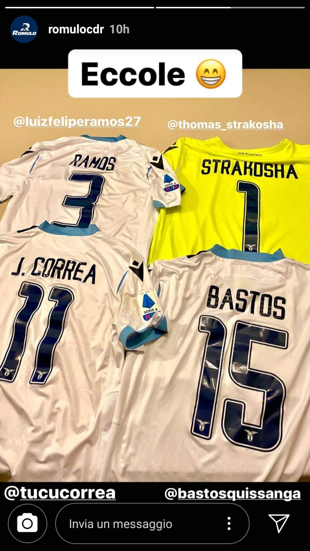 L'esperienza di Romulo alla Lazio è durata solo sei mesi, un tempo ristretto ma che è bastato per tingere il cuore del brasiliano di biancoceleste e per farlo affezionare al solidissimo gruppo degli uomini di Inzaghi. L'esterno del Brescia non perde occasione per dimostrare l'attaccamento verso la Lazio e le amicizie che si è fatto nella rosa e infatti, al termine del match del Rigamonti vinto in extremis dai biancocelesti, ha ricevuto dai suoi ex compagni ben quattro maglie da gioco. E allora parte il sondaggio social: di chi sono le maglie? La risposta è presto fornita da Romulo ai suoi follower: si tratta delle casacche di Strakosha, Luiz Felipe, Bastos e Correa. Un piccolo tesoretto, testimonianza dell'incrocio tra il cammino della Lazio e quello di Romulo.