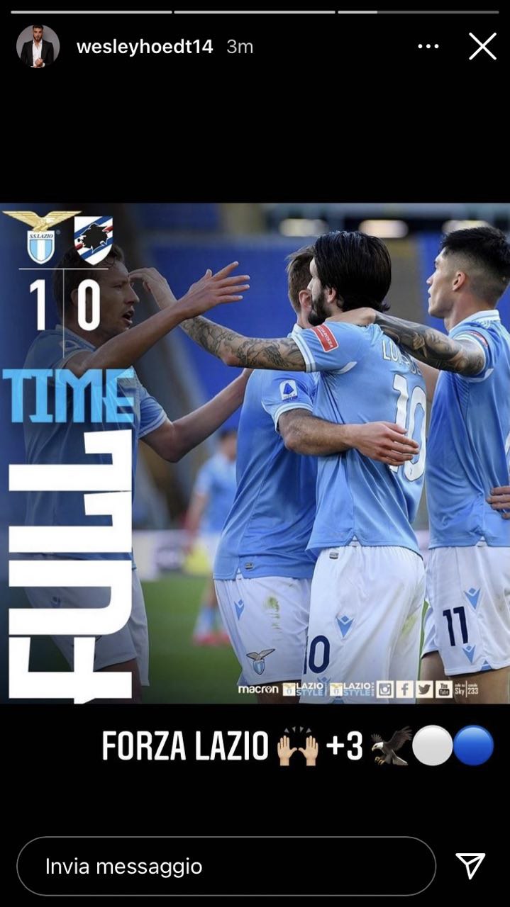 Non è potuto essere in campo a causa della squalifica, ma ha seguito da casa i suoi compagni. Wesley Hoedt ha esultato su Instagram per la vittoria dei biancocelesti ai danni della Sampdoria. Ecco la foto postata dall'olandese sui social.
