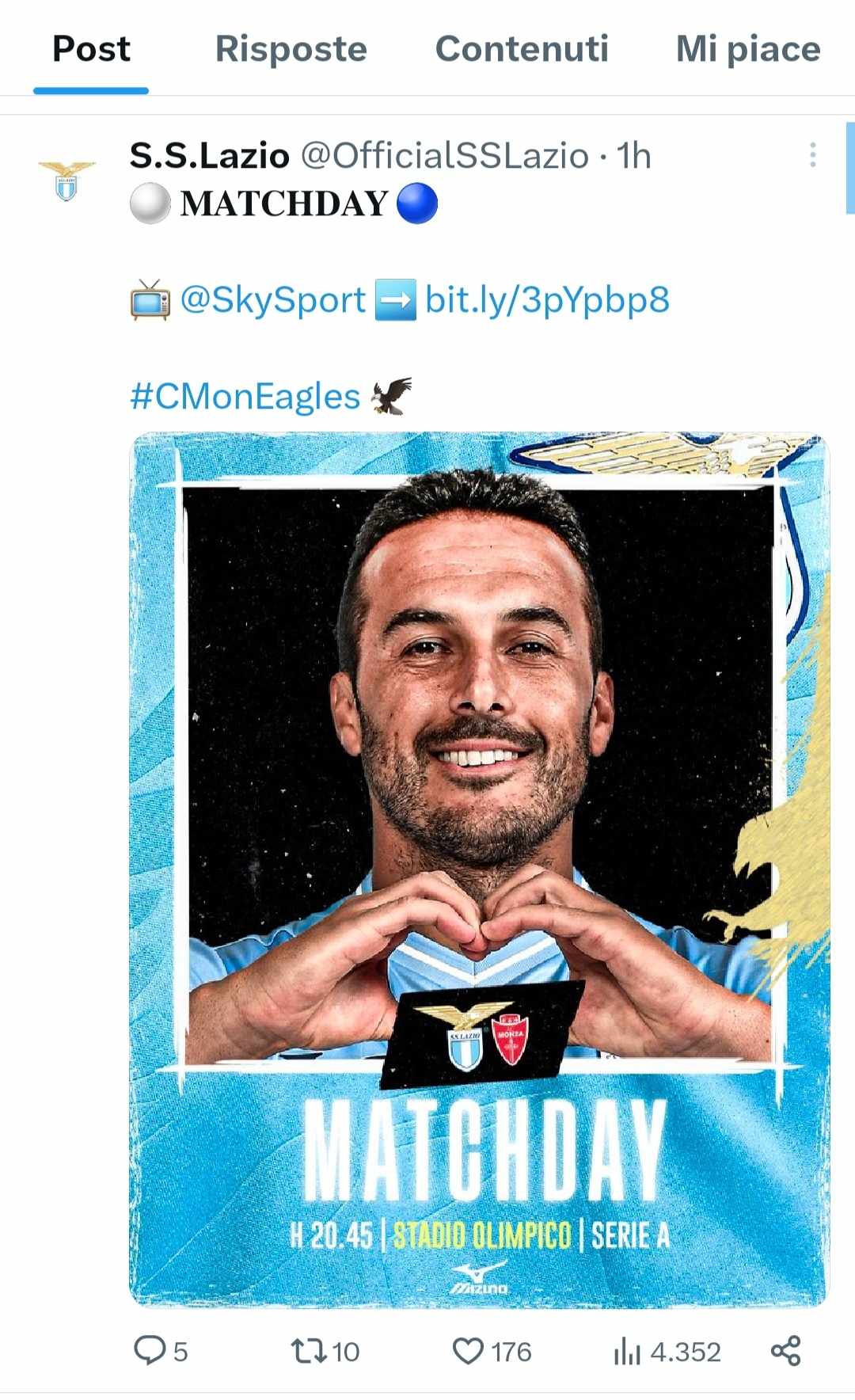 Stasera, la Lazio alle ore 20.45 riceve il Monza. Immobile e compagni, dopo il paraggio allo scadere contro l'Atletico Madrid, puntano all'intera posta in palio contro i brianzoli. Per l'occasione, come di consueto, il club ha postato sui propri profili social una foto di Pedro con la didascalia "C'mon Eagles", l'emoticon dell'aquila e tutte le informazioni relative alla gara odierna.