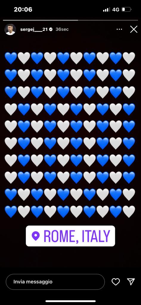 A pochissimi secondi dal fischio finale di Roma - Lazio i calciatori biancocelesti si sono scatenati sotto la Curva Nord per festeggiare con i propri tifosi. Anche chi non è potuto essere in campo come Milinkovic-Savic, ha festeggiato a modo suo: sul suo prifilo Instagram il centrocampista ha pubblicato una foto con una sfilza di cuori bianco e celesti.