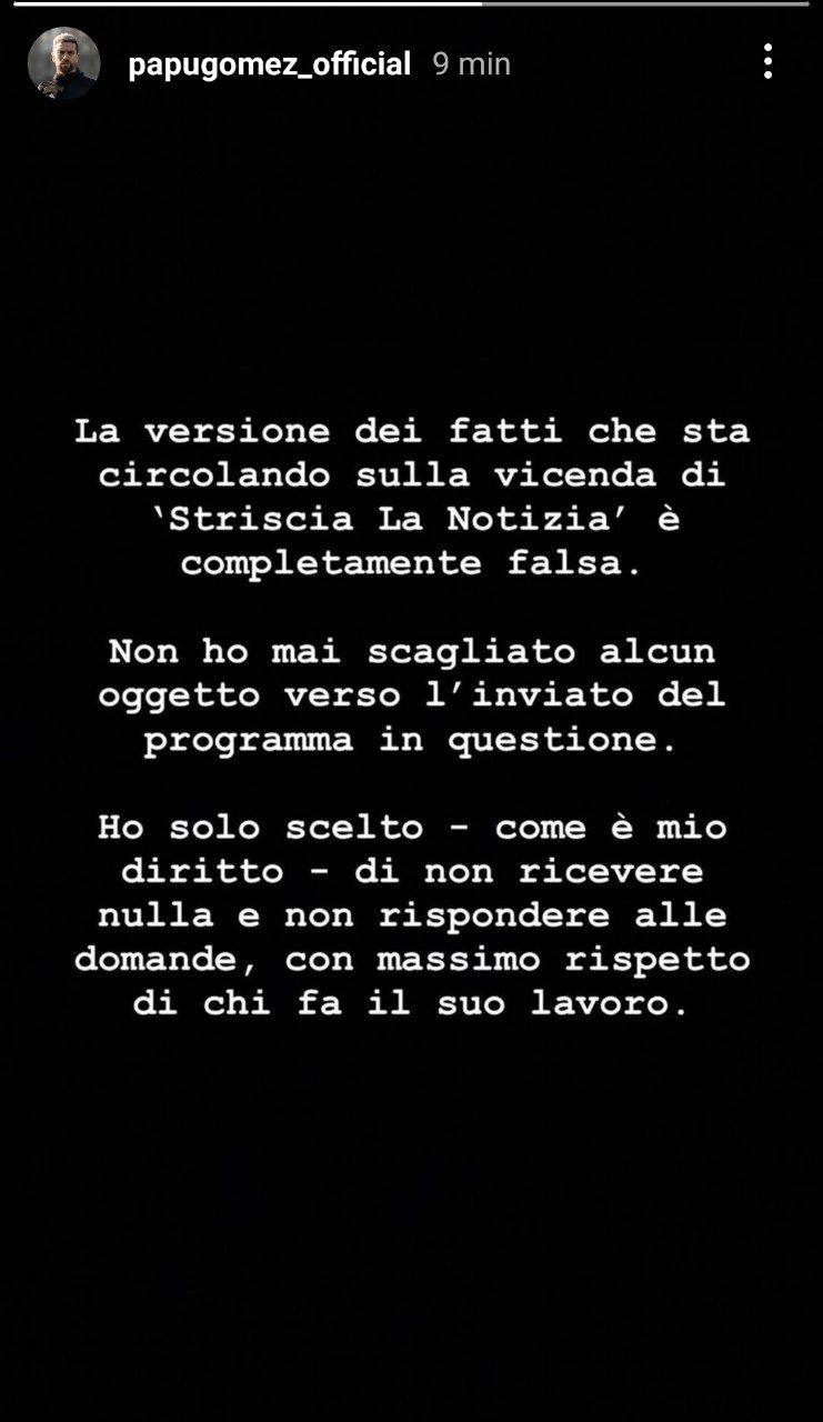 AGGIORNAMENTO ORE 18.30 - Sul proprio profilo Instagram, Gomez ha smentito la versione dei fatti di Striscia la Notizia, che sta circolando in queste ore: "È completamente falsa. Non ho mai scagliato alcun oggetto verso l'inviato del programma in questione. Ho solo scelto - come mio diritto - di non riceverre nulla e non rispondere alle domande, con massimo rispetto di chi fa il suo lavoro".