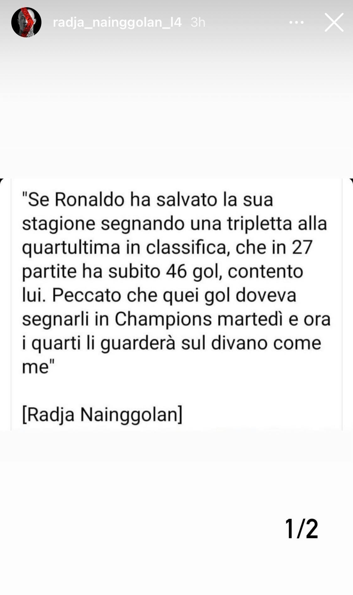 Nuova polemica che vede come protagonista l'ex giallorosso Radja Nainggolan. Dopo la sconfitta subita dal Cagliari per mano della Juventus al belga sono state attribuite queste parole: "Se Ronaldo ha salvato la sua stagione segnando una tripletta alla quartultima in classifica, che in 27 partite ha subito 46 gol, contento lui. Peccato che quei gol doveva segnarli in Champions martedì e ora i quarti li guarderà sul divano come me".