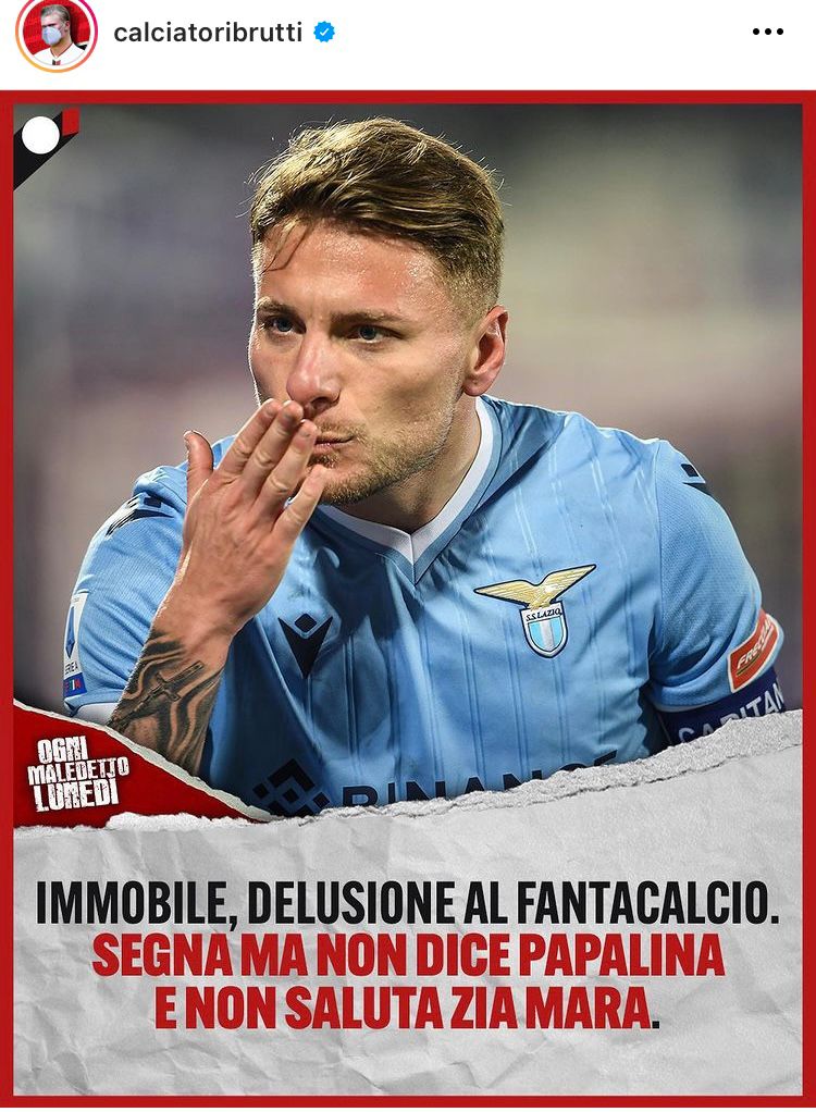 Si è conclusa la 72° edizione del Festiva di Sanremo in concomitanza con il ritorno della Serie A, c’è qualcosa che ha accomunato le due cose: il fantacalcio e il fantasanremo. Le regole del gioco sono più o meno le stesse cambiano solo gli interpreti e le azioni che fanno conquistare punti. Se per il calcio contano i gol egli assist per il fantasanremo contano le parole “papalina” e “Zia Mara”. Sui social la vicenda ha lasciato largo spazio all’ironia, a distanza di giorni se ne continua a parlare e su Instagram la nota pagina Calciatoribrutti si è divertita a prendersi gioco dei protagonisti della 24° giornata di campionato accostandoli anche al fantasanremo. È andata così con il bomber biancoceleste Ciro Immobile, che sicuramente fa guadagnare punti a chi lo possiede al fantacalcio. A tal proposito Calciatoribrutti ha deciso che pur avendo segnato è stato deludente non avendo pronunciato le parole “papalina” e Zia Mara”. Di mira è stata presa anche la Roma, è esilarante la foto del cantante dei Maneskin che esulta al gol annullato di Zaniolo e sotto si legge: “L’unico nello stadio ad aver vinto qualcosa”.