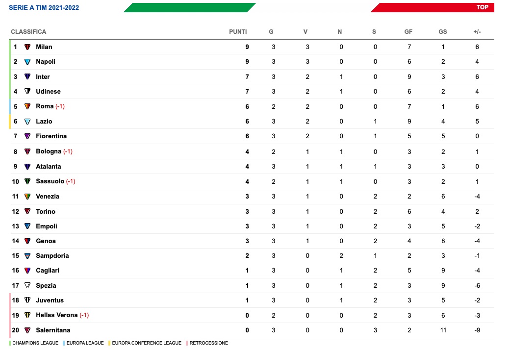 Niente da fare per la Lazio che cercava l'impresa a San Siro. Il Milan ha dimostrato di essere più avanti vincendo il match meritatamente. Questa sconfitta porta i biancocelesti a rimanere fermi a 6 punti occupando la sesta piazza insieme a Fiorentina e Roma (i giallorossi devono giocare alle 20:45 contro il Sassuolo), mentre i rossoneri si lanciano in testa alla classifica a punteggio pieno insieme al Napoli. Tra le due squadre protagoniste della gara delle 18, oltre ai partenopei, i viola e i giallorossi, ci sono Inter e Udinese, entrambe a 7 punti. In zona retrocessione c'è traffico: Salernitana e Verona sono ferme a 0, mentre con un solo punto guadagnato galleggiano Spezia, Cagliari e Juventus. Si attendono gli ultimi due confronti per vedere come effettivamente varierà la graduatoria al termine della giornata.