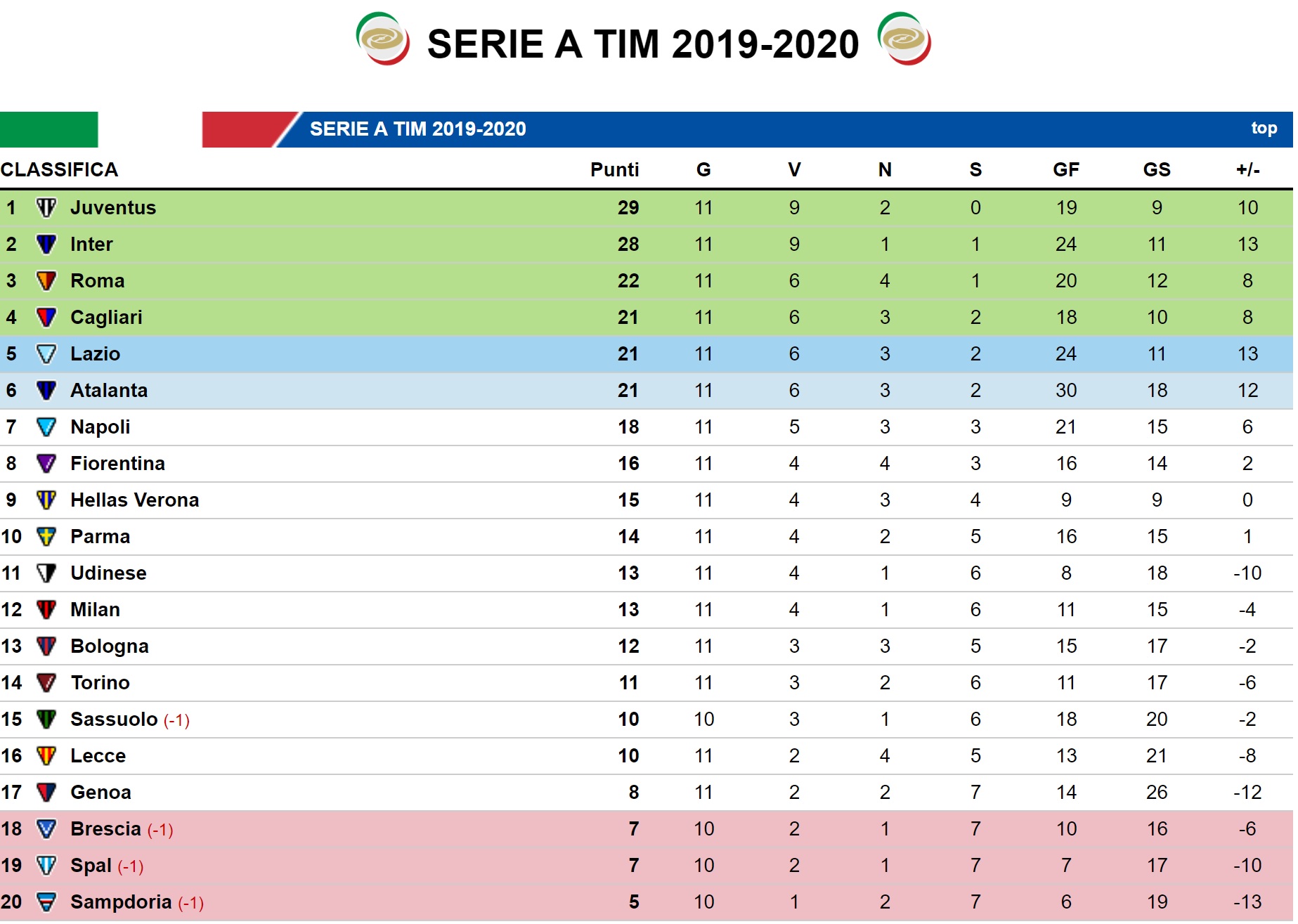 La Lazio batte il Milan a San Siro grazie alle reti di Immobile e Correa e conquista la terza vittoria consecutiva in campionato. I biancocelesti, approfittando della sconfitta dell'Atalanta e del passo falso del Napoli contro la Roma, agguantano il quarto posto a quota 21 punti. Insieme ai ragazzi di Inzaghi anche Atalanta e Cagliari, anche se i capitolini possono far affidamento su una migliore differenza reti. C'è la fila per un posto in Champions.