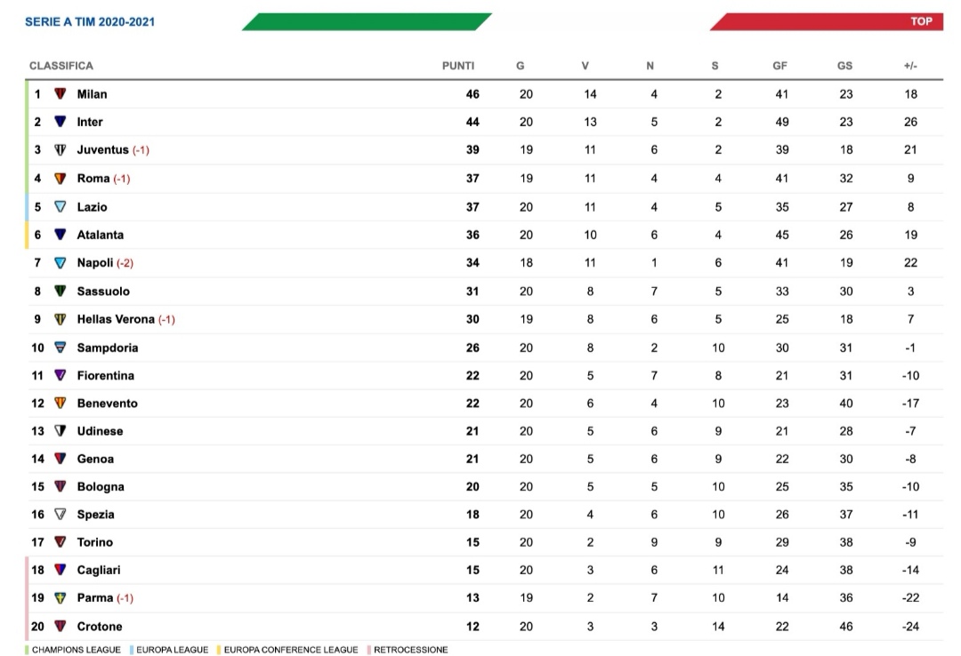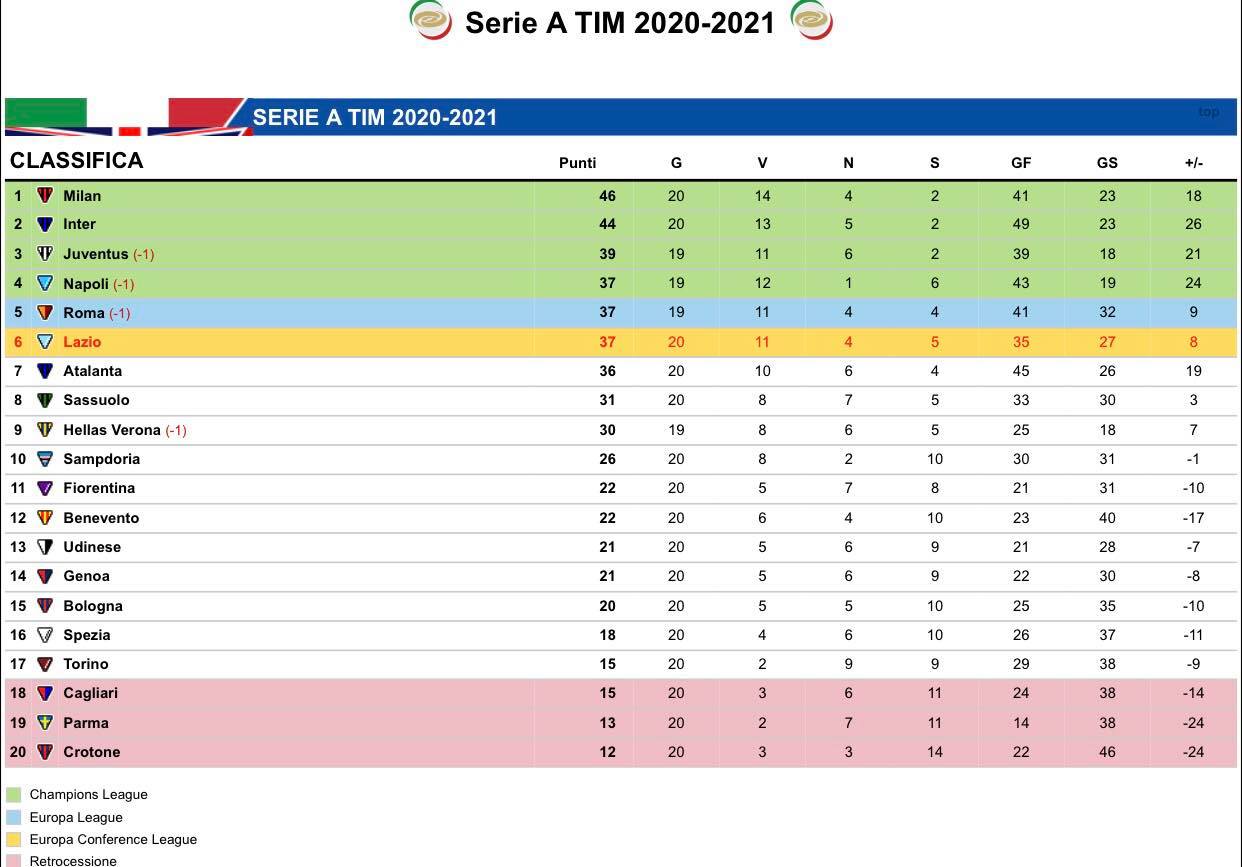 Con la vittoria di Bergamo, la quinta consecutiva in campionato, la Lazio si rilancia prepotentemente in zona Champions League. I biancocelesti sorpassano l'Atalanta in classifica e agganciano momentaneamente la Roma, attesa dalla sfida contro il Verona, al quarto posto. Anche il Napoli fa il suo battendo il Parma e rispondendo a distanza ai ragazzi di Inzaghi. Partenopei e biancocelesti raggiungono quota 37 punti, a -2 dalla Juve e a -9 dalla capolista Milan.