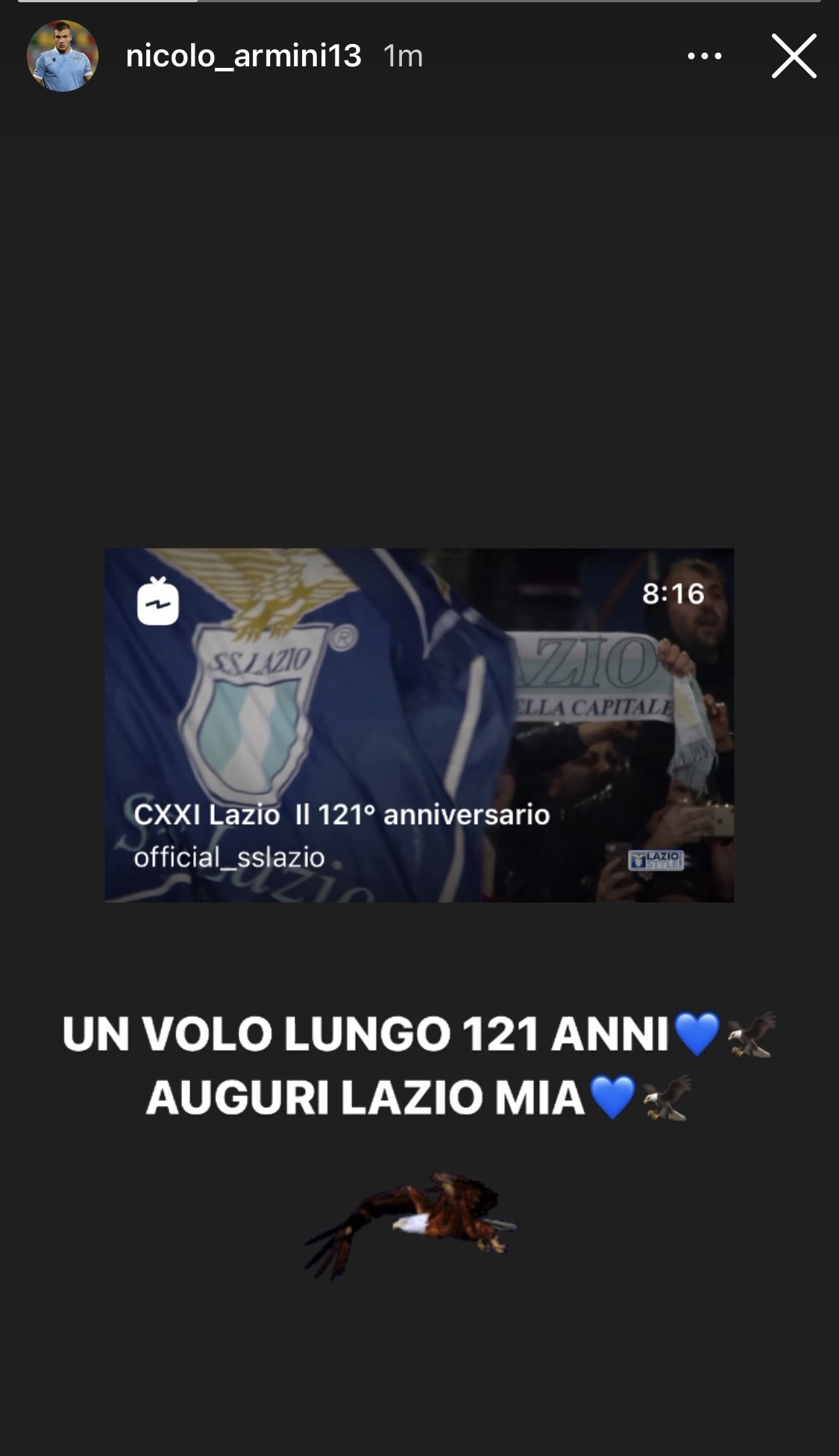 Giornata speciale quella di oggi per la Lazio che festeggia i suoi 121 anni. Il 9 gennaio del 1900 in Piazza della Libertà nasceva la prima società sportiva della Capitale che ancora oggi a distanza di più di cent'anni continua a regalare emozioni ai suoi tifosi e non solo. C'è chi è stato ancora più fortunato e oltre a essere un tifoso indossa anche l'aquila sul petto e in campo difende questi colori. Il primo a fare gli auguri alla Lazio è proprio Nicolò Armini che ha lasciato un messaggio via social: "Un volo lungo 121 anni. Auguri Lazio mia!".