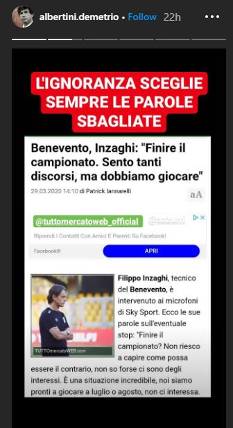 Compagni di squadra, per una stagione, nemici di social. Almeno dalla parte di Demetrio Albertini. Ex centrocampista della Lazio, che nel 2001/02 ha condiviso la maglia del Milan con Pippo Inzaghi. Un legame che non l'ha frenato dal lanciare un attacco nei confronti del suo vecchio compagno, reo di aver dichiarato in un'intervista di voler tornare a giocare al termine dell'emergenza coronavirus. "Nel momento in cui tutto finirà, noi vogliamo tornare in campo, anche ad agosto. Vogliamo finire quanto iniziato per otto mesi per evitare equivoci e che qualcuno subisca dei danni. Qualunque altra decisione penalizzerebbe qualcuno, tra ricorsi in tribunale e fallimenti di società e il calcio non perderebbe due mesi ma due anni", questo aveva detto Inzaghi. Ma Albertini non sembra pensarla allo stesso modo: "L'ignoranza sceglie sempre le parole sbagliate". Nella foto in fondo all'articolo, ecco la storia pubblicata su Instagram.