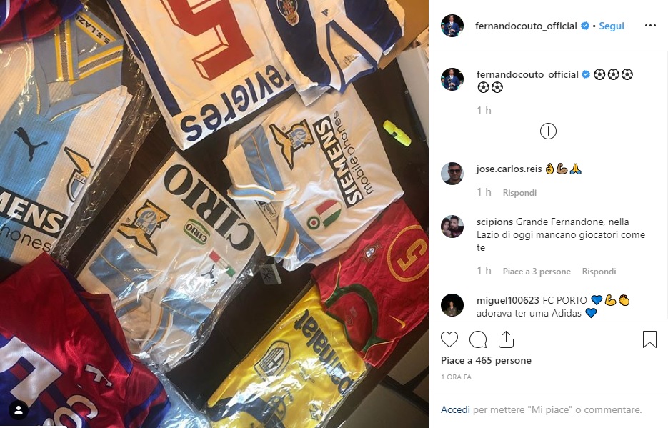 Nel cuore di Fernando Couto è rimasta sicuramente la Lazio. Sette anni all'ombra del Colosseo e il passaggio dall'epoca dei trionfi alla crisi finanziaria. Il portoghese fu il primo nell'estate del 2004 a voler rimanere in biancoceleste e con l'arrivo del nuovo presidente Lotito ereditò anche la fascia da capitano. Su Instagram l'ex numero 24 ha postato una foto con le maglie della sua carriera: al centro tre maglie della Lazio, due del Centenario, una delle quali con Scudetto e Coccarda della Coppa Italia sul petto, e l'altra 'stile Argentina'.