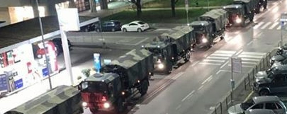 Un'immagine di guerra nel centro di Bergamo. Una colonna di mezzi dell'esercito ha trasportato 60 salme in altre città perché la camera mortuaria cittadina non è più in grado di ricevere i feretri delle vittime del coronavirus. Ben 31 bare sono state portate a Modena, altre ad Acqui Terme, Domodossola, Parma, Piacenza e diverse altre città che si sono rese disponibili.
