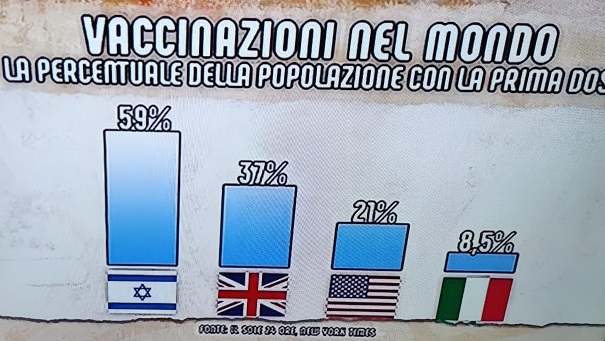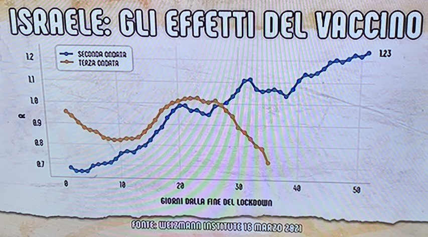 CONTAGI - Sullo sviluppo del contagio in Israele è emblematico il dato diffuso dal Weizmann Institute e riproposto da Di Martedì su La7 (prima immagine in basso). Il confronto è nello svilupppo dell'Rt (indice del contagio) dopo la seconda e poi terza ondata. Nel primo caso (linea azzurra) l'assenza di vaccinazione non ha impedito all'Rt di schizzare dopo 50 giorni a 1,23; nel secondo caso, nonostante lo sviluppo della variante inglese (del 40% più contagiosa), la schermo del vaccino ha fatto crollare l'Rt a 0,7 dopo 35 giorni, in un andamento al ribasso ormai stabile da più di 10 giorni. Nel frattempo il governo israeliano ha iniziato con le riaperture di tutti i settori.