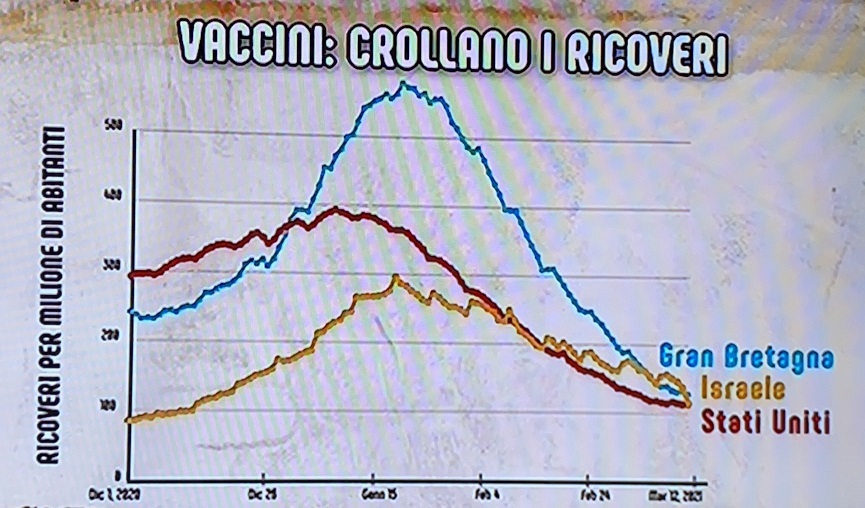 RICOVERI - Interessante anche il dato dei ricoveri. Considerando Israele, Regno Unito e Stati Uniti, dove la prima dose ha raggiunto rispettivamente il 59%, 37% e 21% della popolazione (in Italia l'8,5%) (seconda immagine in basso) si evince che la vaccinazione fa crollare i ricoveri (terza immagine in basso). Emblematico il caso del Regno Unito che fino a fine gennaio aveva circa 600 ricoveri per un milione di abitanti e oggi ne ha circa 100. Gli Stati Uniti toccavano 400 ricoveri per un milione di abitanti nella prima settimana di gennaio e oggi sono a circa 100. In Israele il picco è di 300 ricoveri per un milione di abitanti a fine gennaio e oggi è in discesa a 100. Crollo di contagi e ricoveri, la speranza di un rapido ritorno alla vita normale è legata proprio a questi dati.