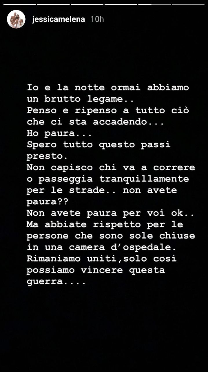 Sono giorni di difficoltà per l'Italia intera, alle prese con l'emergenza Coronavirus e tutte le conseguenze che l'epidemia sta portando all'interno della popolazione. I cittadini, invitati a rimanere nelle proprie case per evitare che il contagio si espanda ulteriormente, stanno vivendo momenti di paura e preoccupazione. Lo testimonia, per esempio, il breve messaggio di Jessica Immobile su Instagram: "Io e la notte ormai abbiamo un brutto legame. Penso e ripenso a tutto ciò che ci sta accadendo. Ho paura, spero tutto questo passi presto. Non capisco chi va a correre o passeggia tranquillamente per le strade, non avete paura? Non avete paura per voi, ok, ma abbiate rispetto per le persone che sono sole chiuse in una camera d'ospedale. Rimaniamo uniti, solo così possiamo vincere questa guerra".